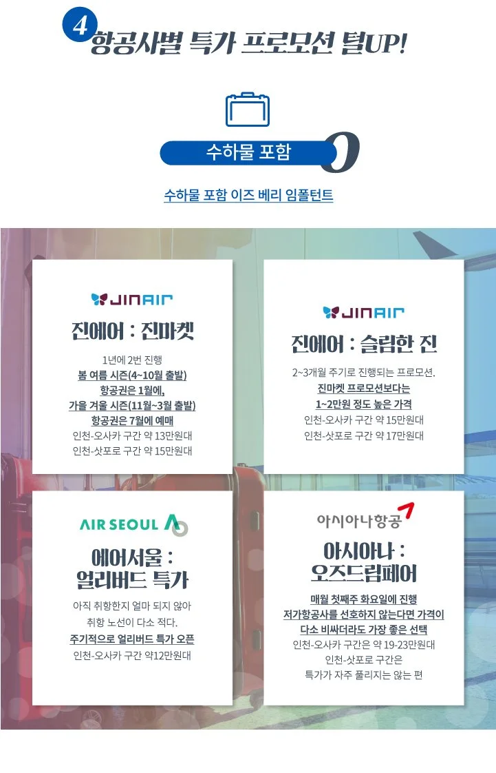 여행사와 항공사에 따라 여행객들을 행복하게 해주는 특가 행사가 반드시 존재한다. 특가 항공권이 풀리는 시기는 보통 시즌별, 주기별로 구분되는데, 시즌별로 진행되는 항공권이 가장 싸다.