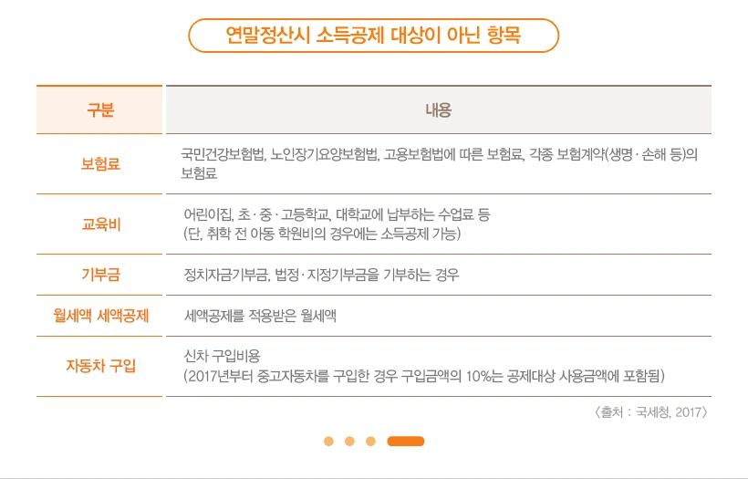 물품 구입비용이나 서비스 이용대금은 소득공제 대상이 아닌데요. 새 차를 구입하거나 공과금, 아파트 관리비, 보험료, 상품권 구입비, 등록금, 수업료, 해외 결제 금액, 현금서비스 등은 카드로 결제하더라도 소득공제 적용 대상이 아니에요. 단, 2017년 1월 1일 이후 중고 자동차를 카드로 구입했다면 결제금액의 10%까지 카드 소득공제를 받을 수 있도록 세법이 개정되었으니 이 점 참고해 주세요.