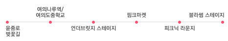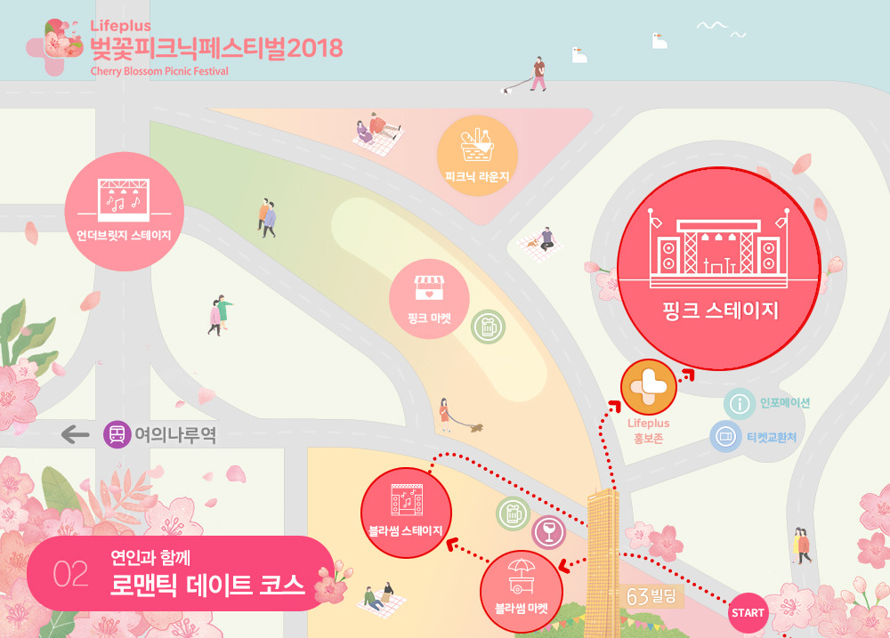 썸타는 그 사람과의 봄 피크닉, 예감이 좋다고요? 윤중로에서 만개한 벚꽃을 감상 한 뒤, 여의나루역이나 여의도중학교 정류장에서 벚피페 나들이를 시작해보세요. 원효대교 남단에 자리잡은 언더브릿지 스테이지에서 인디뮤지션의 공연을 보고 핑크마켓과 피크닉 라운지에서 벚꽃 핀 봄을 한껏 즐기고 다양한 공연과 행사들을 즐기다가 블라썸 스테이지에서 보는 불꽃놀이로 마무리~ 어때요? 사랑이 블라썸할 수 있을 것 같죠?