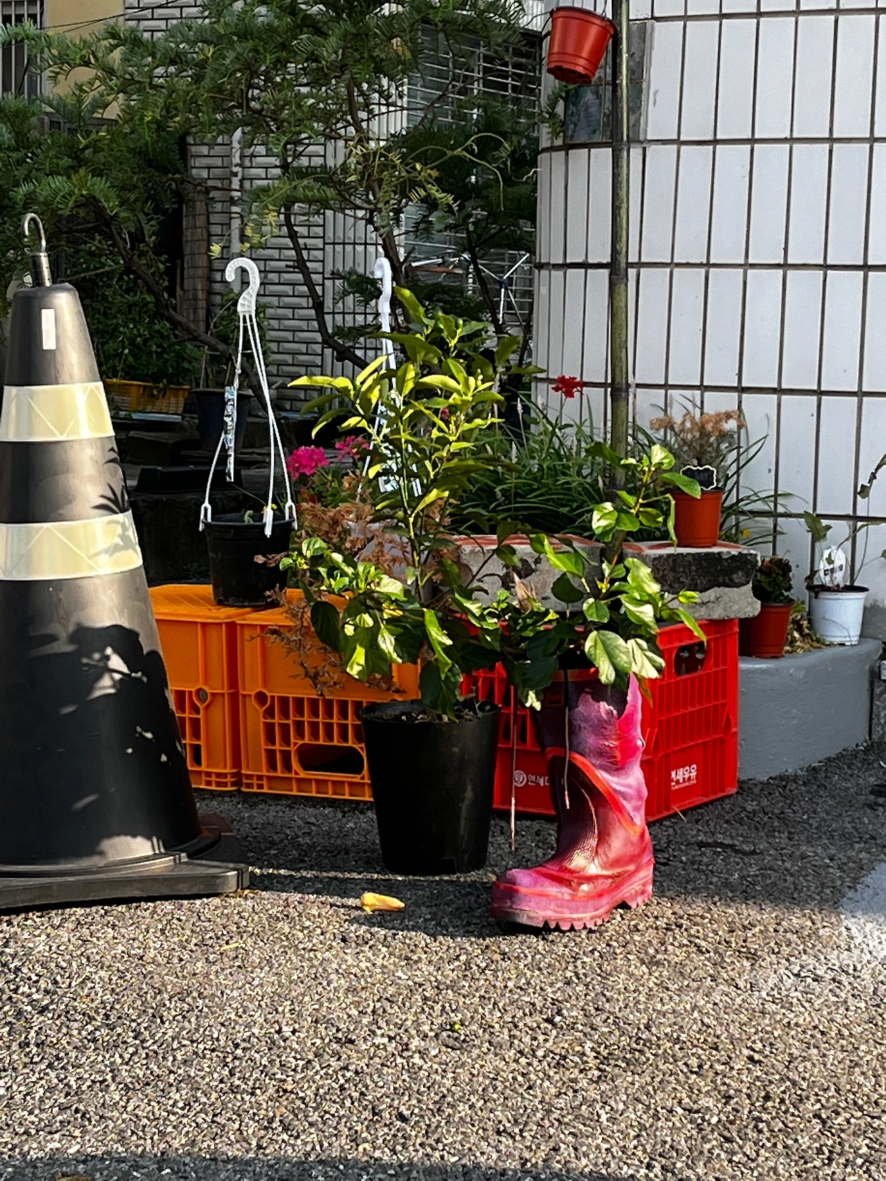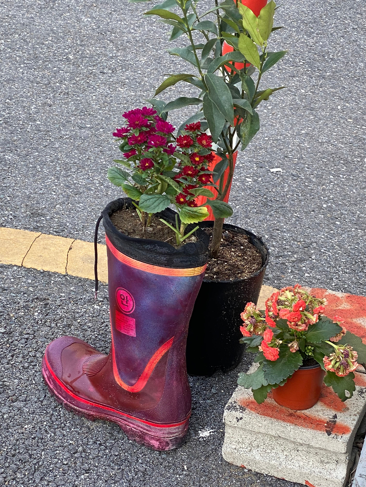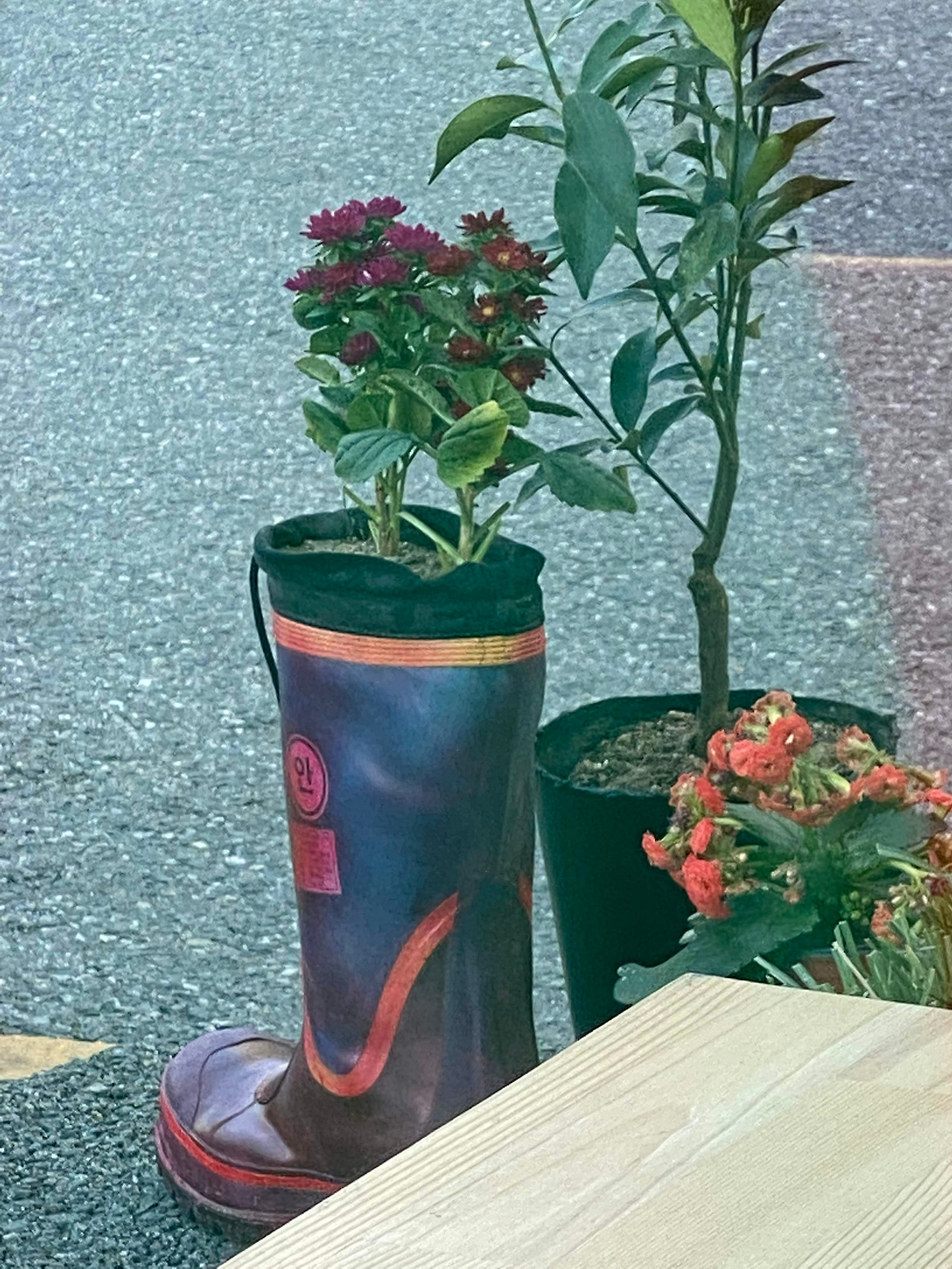 장화 속에서 자란 식물이 꽃을 피우고 그 꽃이 피는 시간들,