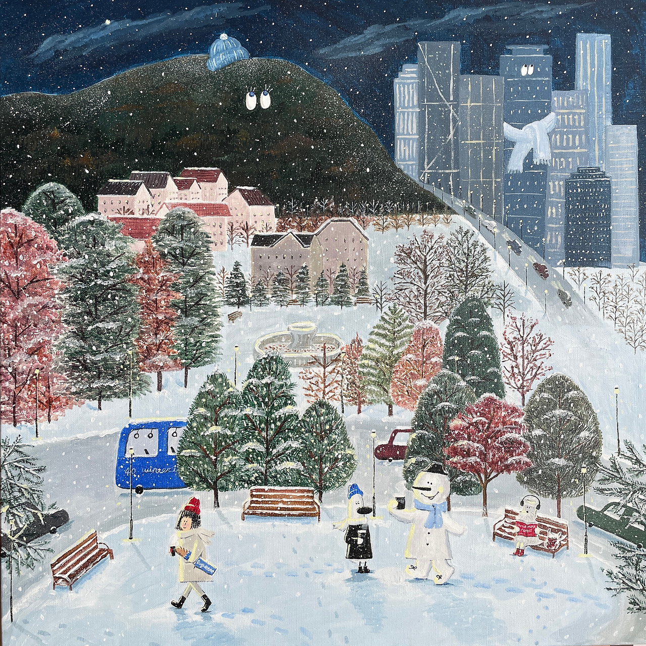 캔버스 위에 여전히 가을의 끝을 지나는 마을의 저녁풍경을 먼저 채워두었다. 높다란 빌딩들도 세워지고, 나지막한 집들도 촘촘하게 들어선다. 공원에는 아직 가을을 다 떨구지 못한 나무들도 빼곡하게 채워둔다. 초저녁 공기는 꽤나 차가워졌고, 며칠 전과 다르게 해가 벌써 넘어갔는지 초저녁 시간에도 벌써 어둑어둑해졌다. 아마도 캔버스 안에도 곧 겨울이 시작될 것이 분명하다. 나는 제법 쌀쌀해진 날씨에 옷을 여미고, 마른 잎이 채 떨어지지 않은 공원을 부지런히 지나, 집으로 가는 발걸음을 재촉하고 있다. 퇴근시간 분주해진 거리에 자동차들이 느릿느릿 움직이고, 마을 창문에도 하나 둘, 불이 밝혀진다. 공원 가로등에 일찌감치 불이 들어오고, 어둑해졌던 거리은 금세 환해진다. 부지런히 걷는 발걸음 위로 작은 눈송이가 떨어진다. 첫눈이다! 가로등 불빛에 먼지처럼 날리던 작은 눈송이는 이내 하늘을 뒤덮고, 첫눈인데도 그 기세를 보니 금방 그칠 것 같지는 않다. 아직 마른 잎을 떨구지 못한 붉은 나무 위로 하얀 눈이 곱게 뿌려지고, 공원은 이내 시끌벅적해진다. 계속 가을에 머무를 것 같았던 세상은 순식간에 겨울로 가 앉는다. 캔버스 안 구석구석 눈을 흩뿌리고 그 위에 한참 더 작은 눈을 뿌리고 나니, 첫눈을 놓치기 싫어 부지런히 밖으로 나온 친구들도 하나둘씩 보인다. 올 겨울에도 어김없이 돌아온 스노우맨이 반가워 인사를 건네는 페프리카 씨도 보인다. 공원 한편에는 나이가 지긋해진 견선생이 방금 장 봐온 딸기를 벤치에 잠시 내려놓고, 내리는 눈을 한참 바라보고 있다. 제법 심각한 표정의 미간 솜털 밑 눈동자가 진지하다. 까맣게 곱쓸거리던 털이 은빛으로 변한 모습이 벌써 무지개다리를 건넌 지 한참 지난 우리 집 뿌선생(슈나우저 강아지)을 닮았다. 조금 추워 보이던 마을의 뒷 산과 저 멀리 차가워 보이는 빌딩에는 따뜻한 모자를 씌고, 포근한 목도리를 둘러준다. 이제 단단히 채비를 하고 겨울을 맞이할 때이다. 이제 진짜 겨울이 왔다.