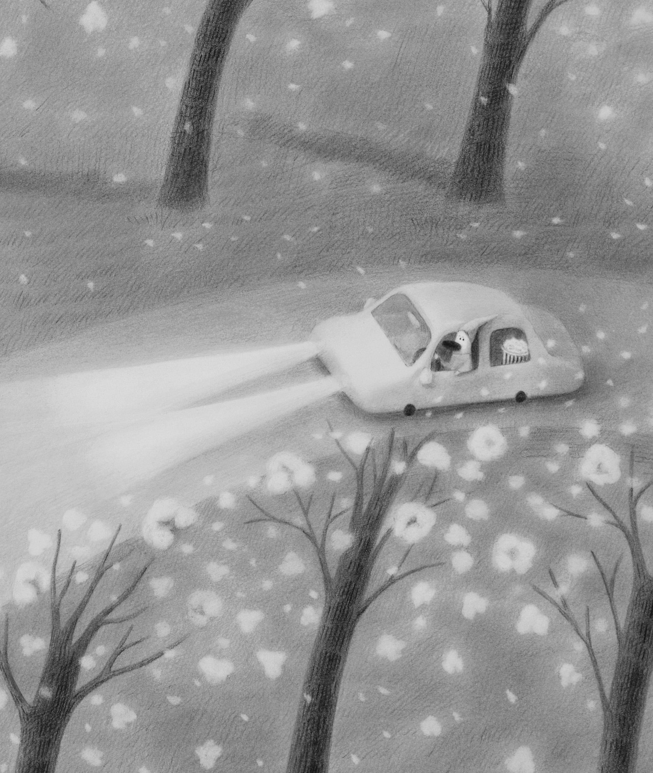 이 그림은 작년 이 맘 때쯤에 그렸는데 그때도 아마 지금의 내 심정과 비슷했었나 보다. 2월에 봄날의 벚꽃 길을 그린 것을 보면 말이다. 이 그림의 제목은 조금 엉뚱하게 들릴지 모르지만 팝콘로드(Popcorn Road)이다. 봄밤의 길을 따라 핀 벚꽃을 하얀 팝콘처럼 표현했었는데, 창문을 잔뜩 열고 드라이브 중인 페프리카*씨의 뒷좌석에는 고소한 팝콘이 벚꽃인지 팝콘인지 분간할 수 없는 모습으로 함께 흩날리고 있는 중이다.