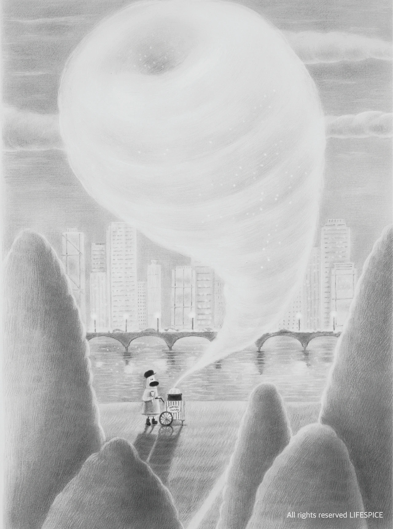 그러니 만일 누군가 나에게 그림을 그리면서 제일 신이 나는 순간은 언제냐고 묻는다면, 아마도 나는 마음에 드는 아이디어를 떠올린 순간이라고 대답할 것 같다. 그 스파크 튀는 즐거움을 만나기 위해 자꾸만 책상으로 향하고, 익숙한 길을 걸을 때에도 영화를 볼 때에도, 좋아하는 책을 읽을 때에도 조금은 아이디어의 조각들을 모으기 위한 채비를 하게 된다. 그 작은 아이디어의 조각들을 나의 생각의 자루에 모아두었다가, 하얀 종 이 앞에서 유독 자신이 없는 어느 날, 툭-꺼내보기로 한다. 그럼 페프리카씨가 자루에서 몇 스푼 덜어낸 설탕이 거대한 솜사탕 토네이도가 되는 것처럼, 나의 작은 아이디어 조각들도 어쩌면 누군가의 마음에 와닿아 거대한 회오리를 일으키는 날이 올지도 모른다는 꿈을 갖고 말이다.