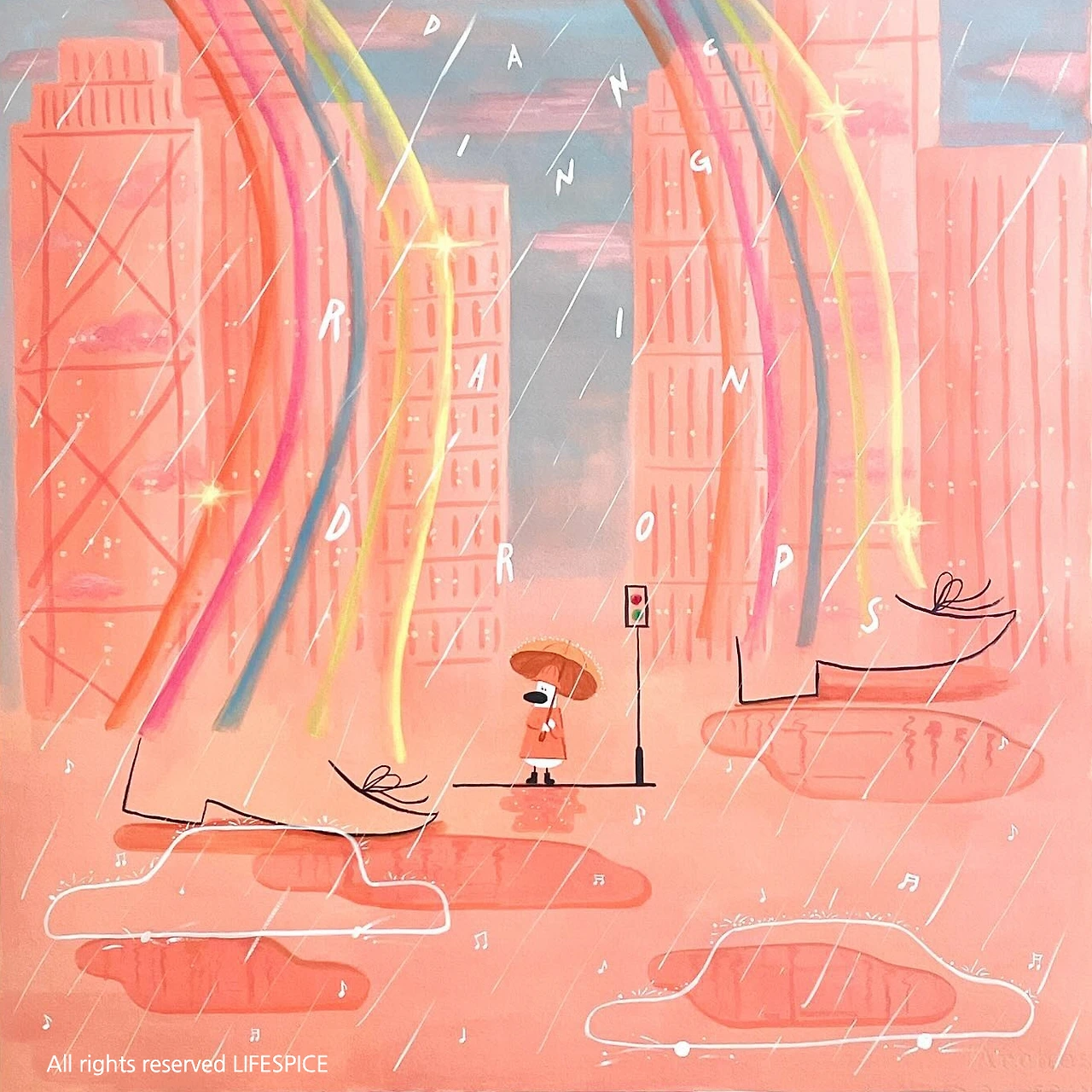 위에 소개한 그림은 'Dancing Raindrops'라는 그림이다. 인상 깊도록 아름다웠던 무지개를 보고 난 그날 오후, 해가 넘어가며 시시각각 변화하던 무지개 빛으로 가득 찬 도시를 유쾌하게 그려보고 싶었다. 그림 속에서는 가볍게 내리는 빗속에서 무지개 빛 판타롱 팬츠를 입고, 레트로한 음악에 여유 있게 박자를 맞추는 누군가처럼 그려보았는데, 이렇게 표현해보고 나니 이젠 정말 추적추적 내리는 비도 유쾌한 기분으로 맞이할 수 있을 것 같은 기분이 들기도 했다. 비가 개이고 창문을 열면 어쩌면 반원으로 선명하게 뜬 예쁜 무지개를 다시 만날 수 있을 테니 말이다.