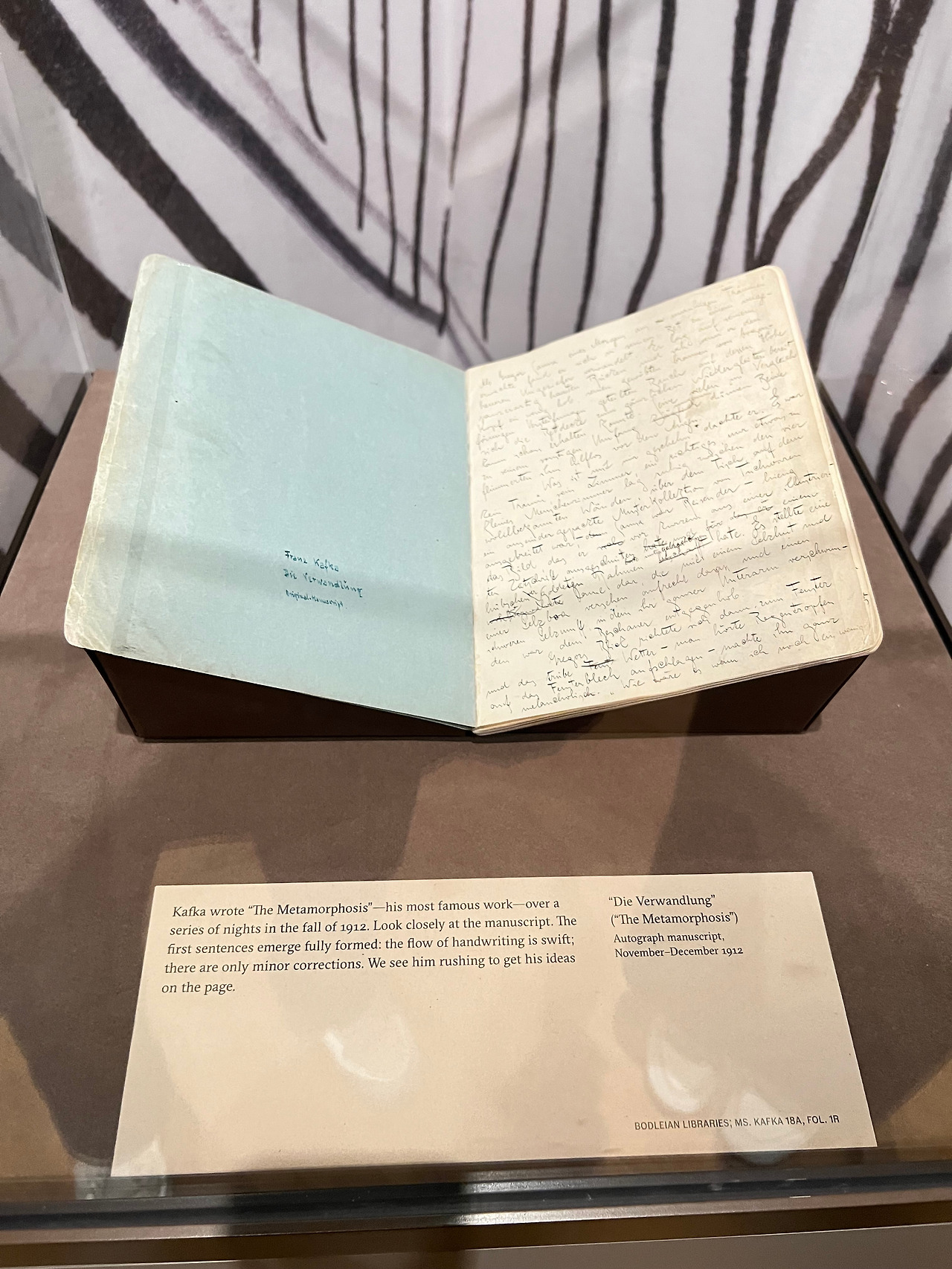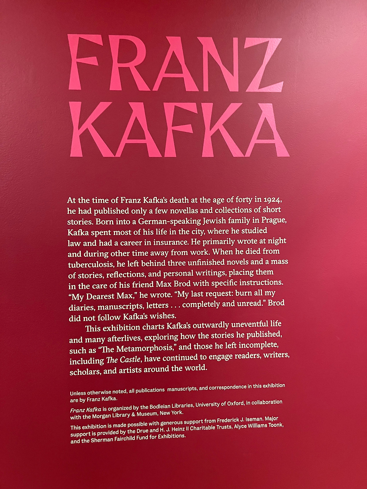 이번 전시는 옥스퍼드 대학교 보들리안 도서관(Bodleian Libraries)과 협력하여 지난해 11월부터 진행되고 있는 특별 전시회였다. 미국에서는 처음으로 체코 작가인 카프카의 초고 원고 및 일생에 관한 자료들 전시한 것이라고 한다.