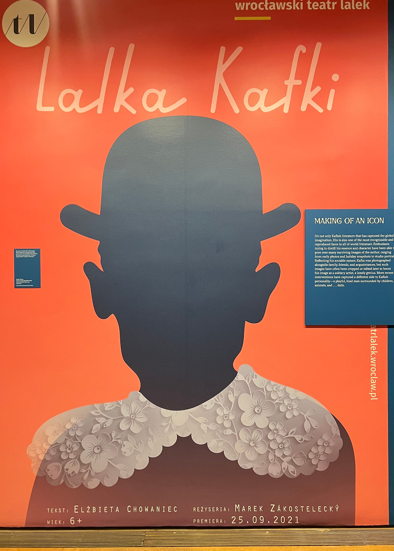 유리로 된 투명 엘리베이터를 타고 한층 위로 올라가 체코를 대표하는 천재 작가 '카프카 특별전' 사인을 따라 걷는다. 빨간 바탕에 그의 이미지를 형상화 한 대형 포스터가 보인다. 어릴 적 읽었던 충격적 반전 소설 <변신> 작가의 세계관으로 입장한다.