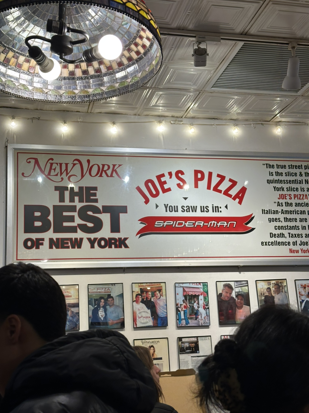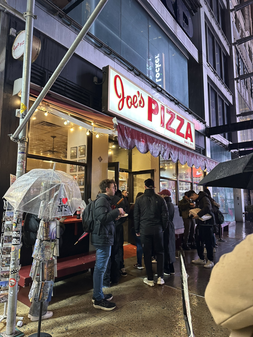 뉴욕 거리에 비가 내린다. 오늘 저녁 식사는 Joe's Pizza로 정했다. 스파이더맨 2를 보면 스파이더맨이 피자를 배달하는 장면이 나오는데 이때 등장한 곳이 바로 Joe's Pizza, 이 집이다. 뉴욕 맨해튼 그리니치 빌리지에 위치한 정통 뉴욕 스타일 피자집으로, 1975년에 이탈리아 나폴리 출신의 이민자 조 포추올리(Joe Pozzuoli)에 의해 설립됐고, 지금까지 창업주 본인이 직접 운영하고 있다. 얇은 크러스트에 치즈, 마게리타, 페퍼로니 등 다양한 토핑을 얹었으며 주로 조각 피자로 판매된다. 이 피자 집 앞에는 언제나 피자를 사기 위해 긴 줄을 선 사람들을 볼 수 있다. 남녀노소 누구나 부담 없이 허기를 채울 수 있는 가성비 좋은 스트릿 피자 맛집이다. 뉴욕에 오시면 꼭 한번 들려보시길!