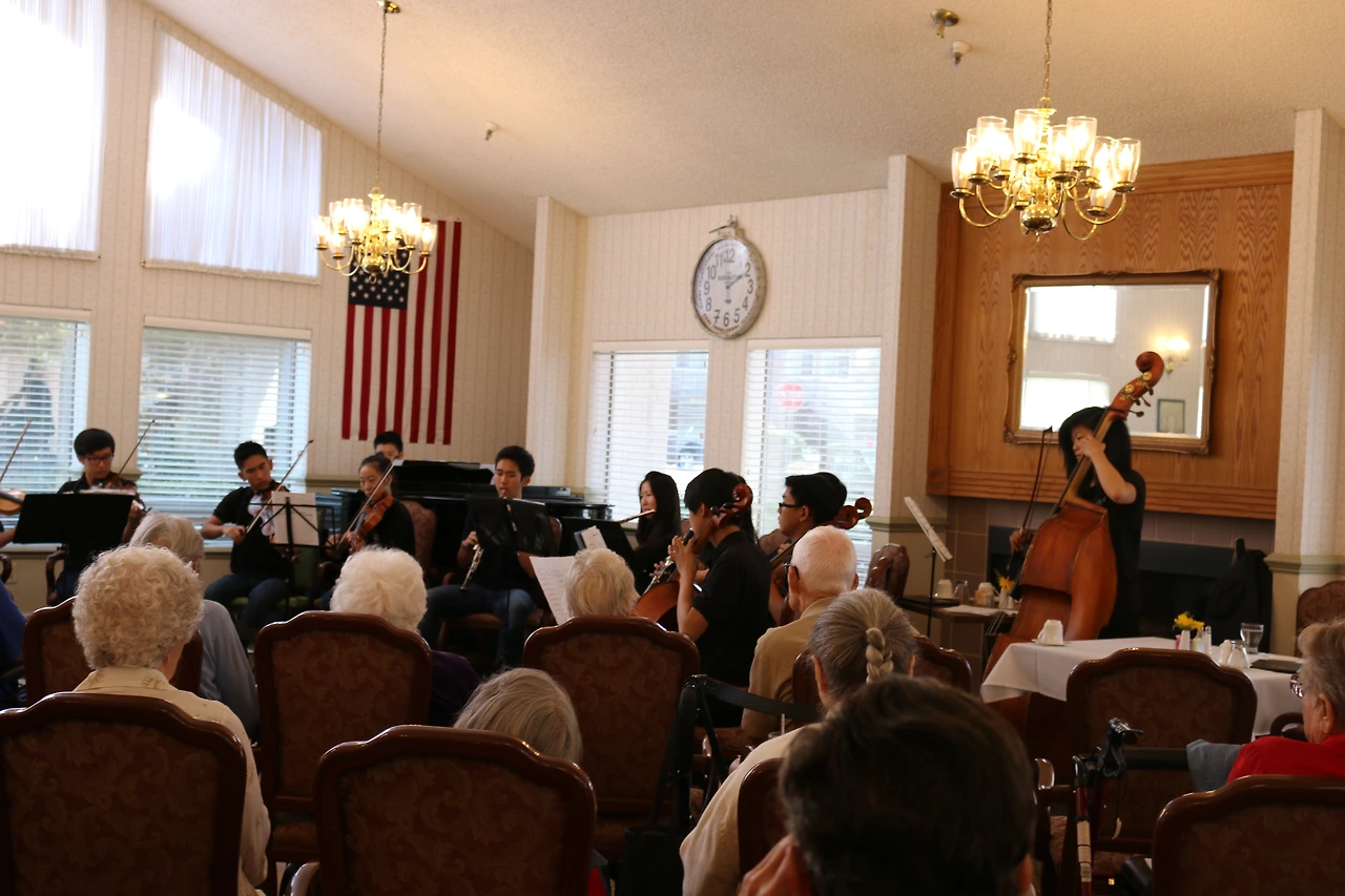 고등학교 아이들은 방학 때를 이용해 자신의 특기를 이용한 발런티어 활동을 한다. <사진>은 음악 특기생들이 실버타운에 방문해 봉사 연주를 하는 모습이다.