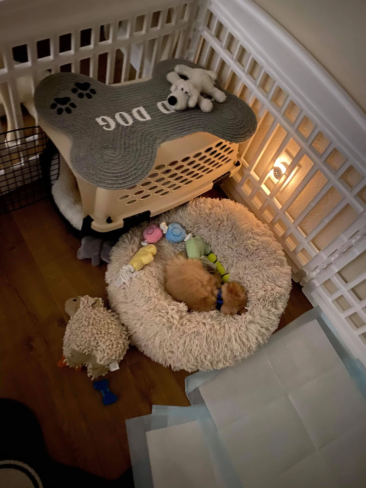 내 울타리 방 안에는 자동차에서부터 타고 왔던 커넬이 있어요. 커넬 밖에는 폭신한 침대, 밥그릇과 화장실(배변패드)까지 갖춰져 있어요. 물론, 누나가 넣어준 장난감도요... 울타리 문은 내가 혼자 밖으로 나가지 못하게 밖에서 잠겨있어요. 엄마가 아직 나는 너무 작아서 혼자 돌아다니는 건 위험하댔어요.