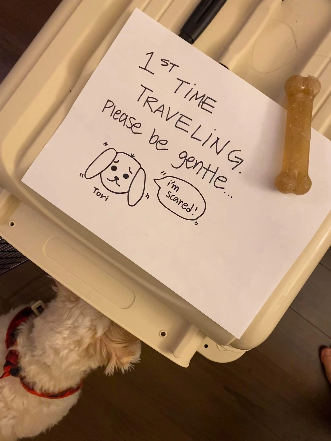 누나는 내가 타고 이동할 커넬에 '첫 번째 비행기 여행이에요. 잘 부탁드려요."라고 쓴 종이를 붙였어요.