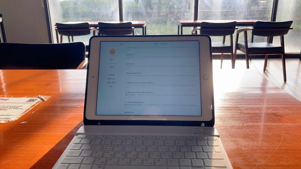 자리를 잡고 아이패드를 꺼내고 글을 쓰기 시작한다. 여기 도착해서야 알게 된 사실인데, 여긴 책 읽는 공간이 주목적이어서 와이파이를 아예 지원하지 않는다고 했다. 아무리 그래도 와이파이 없는 북카페는 처음 봐서 조금 당황했다. 핸드폰으로 테더링을 했지만 아무래도 좀 느리고 불안정했다. 그 점은 좀 아쉬웠다.