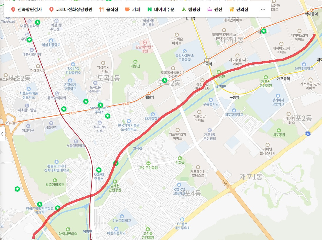 이 동네로 이사 와서 발견한 것 중 하나는, 드라이브하기 좋은 양재천을 따라 있는 뚝방길이다. 신호등이 (거의) 없어서 천천히 달리기 좋은데 중간중간 계속 과속방지턱이 있어서 어차피 속도를 내려고 해도 낼 수가 없다. 그리고 양재천과 그 건너편의 가게나 동네를 사이를 왔다 갔다 하는 사람들이 계속 길을 건너기 때문에 이 길에서는 속력을 내면 안 된다.