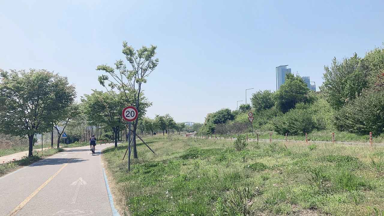 자전거 앞에 달린 바구니에 돗자리와 가방과 입고 온 겉옷을 올려놓고 달릴 준비를 한다. 고프로가 있으면 이 풍경을 찍어놓고 싶을 정도로 기분이 좋다. 자전거로 달리면서 찍는 풍경. 자전거길이 익숙한 안양천에서는 한 손으로 자전거를 타면서 휴대폰으로 슬쩍슬쩍 촬영도 했지만 여긴 초행길이니까 조심하기로 한다. 익숙한 내 자전거도 아니고 하물며 일 년 만에 타는 라이딩이니까.