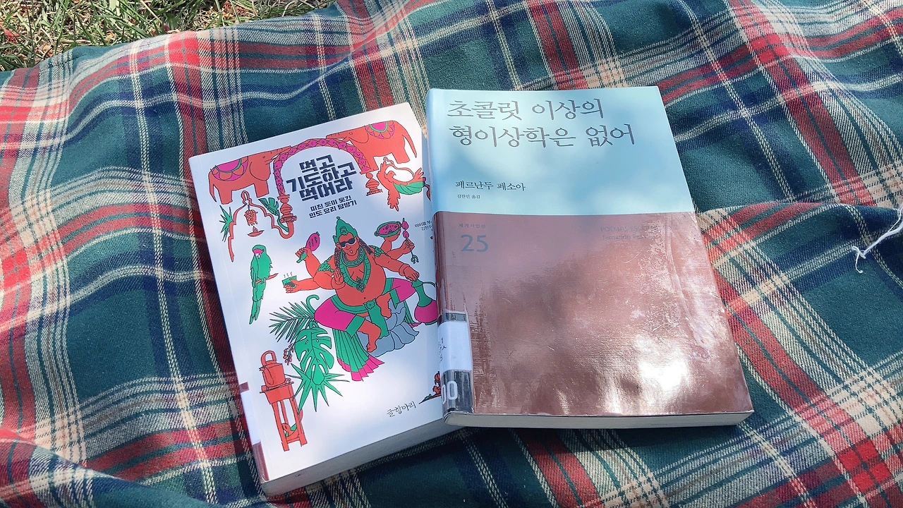 오늘은 책을 두권 가지고 와서 읽기로 했다. 먼저 시인 페르난도 페소와의 시집과 지난번에 북유럽 관련 꽤 재미있게 읽었던 <거의 완벽에 가까운 사람들>을 쓴 작가 마이클 부스의 인도요리 탐방을 빙자한 일종의 여행기 <먹고 기도하고 먹어라>까지 두 권이다.