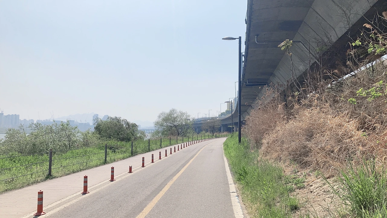 그동안 한강 지류에서 자전거를 탔던 것과는 느낌이 다르다. 자전거 도로가 큰 대교들 교각 밑에 있어서 그런지 가는 길마다 그늘이 져있다. 회색빛의 커다란, 나를 집어삼킬 듯한 다리의 교각들, 한강 건너편에 주욱 늘어서 있는 건물과 아파트. 그리고 오른편에는 내가 일 년 중 가장 좋아하는 연둣빛의 풀들, 나무들이 펼쳐져 있었다.