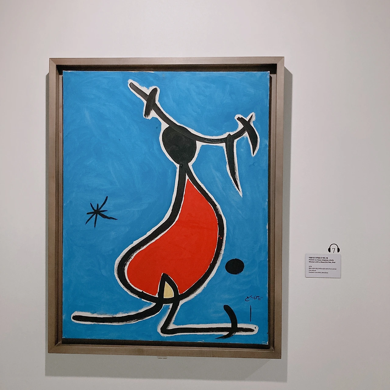 작품 중에 색감이 강렬하면서 마치 해가 떨어지고 있는 바닷가 풍경 같은 그림이 하나 있었다. (위 사진 4컷 중 왼쪽 아래) 호안 미로 작품의 대부분 제목이 여인, 별, 새 이 세 종류의 단어로 돌아가면서 지어진 게 많길래 그 세 개 중 하나 일까 싶었다.