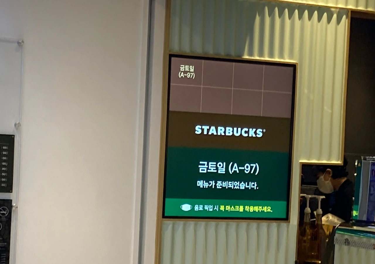 최근에 신세계가 미국 스타벅스 본사 지분을 인수해서 최대주주가 되었다고 들었다. '좋아하는 걸 좋아해' 같은, 너무나 뻔하고 한국적인 마케팅 문구 같은 거 만들지 말고 이런 거나 편하게 한국식으로 바꾸면 좋겠다는 생각이 들었다. 아무튼 전광판엔 주문번호 아니면 자기가 지정한 닉네임이 뜬다.