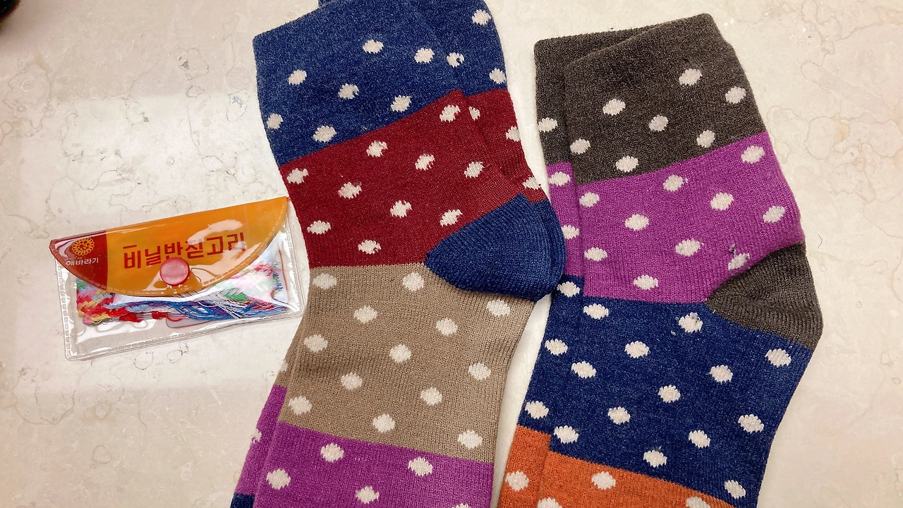 크리스마스 당일날, 낮에 자유수영을 다녀오고 공연을 보러 오고 나니 밤 10시다. 내일은 월요일이라 출근해야 돼서 일찍 누워볼까 싶어서 컴퓨터도 끄고 이도 닦고 침실에 들어왔다. 그런데 화장대 위에 눈에 띄는 것이 있다. 바로 얼마 전부터 계속 바느질해야지 하고 놔뒀던 구멍 난 겨울양말 두 켤레였다.