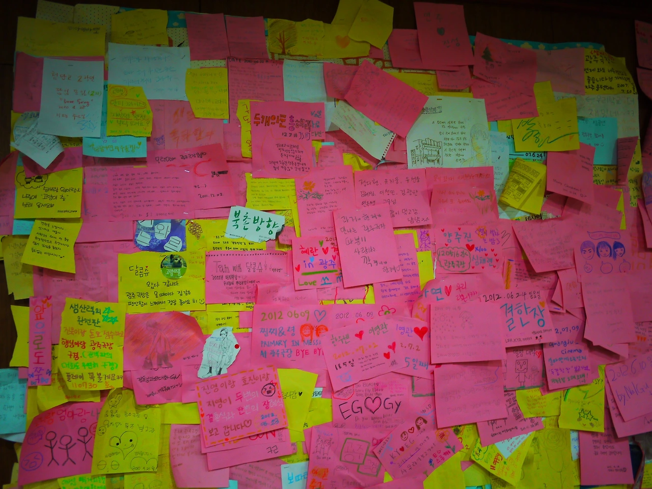 로비를 둘러보았다. 대전아트시네마보다는 규모가 조금 컸고, 단관인 듯했다. 역사가 오래된 곳인지 일제 강점기 때 영화를 검열하던 직원이 앉던 임검석에 대한 설명도 있었다. 사람들의 메모가 붙어있는 커다란 벽이 있었고 그 주변을 사진과 메모로 꾸며놓았다. 테이블에는 색연필과 종이가 있었다. 나는 아무것도 쓰지 않고 나왔다.
