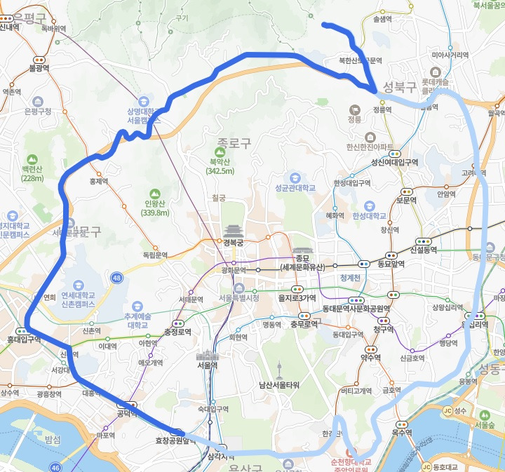 보통 버스노선은 직선코스 그러니까 동서횡단, 남북횡단, 동동서-서북서 횡단 이런 식의 코스가 많다. 그런데 이 버스는 특이하게 서울 강북의 시내를 원을 그리며 돈다. 게다가 이 버스노선은 나하고 개인적인 인연도 있어서 더 특별하다. 바로 내가 대학생 때 주야장천 이 버스를 타고 학교에 다녔기 때문이다. 전 구간을 타본 적은 없고 오로지 학교에 가기 위해 지하철역-학교 사이의 필요한 구간이긴 하지만.