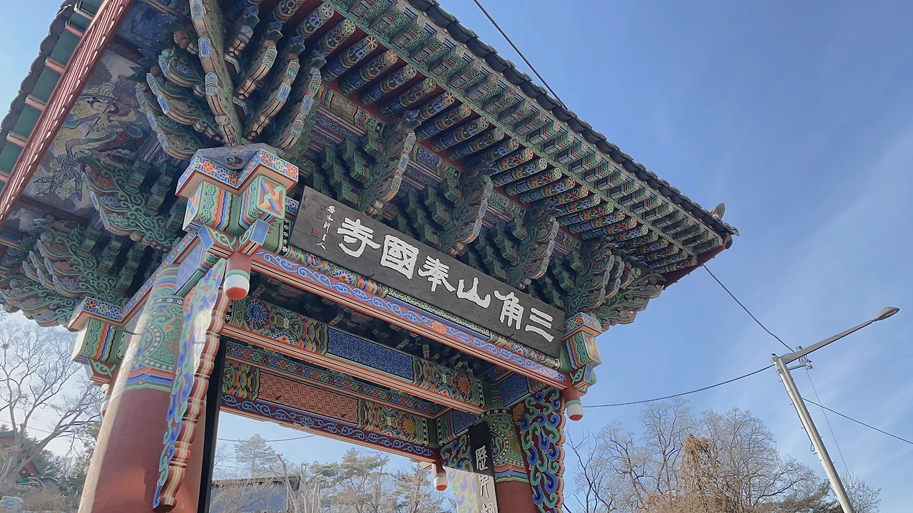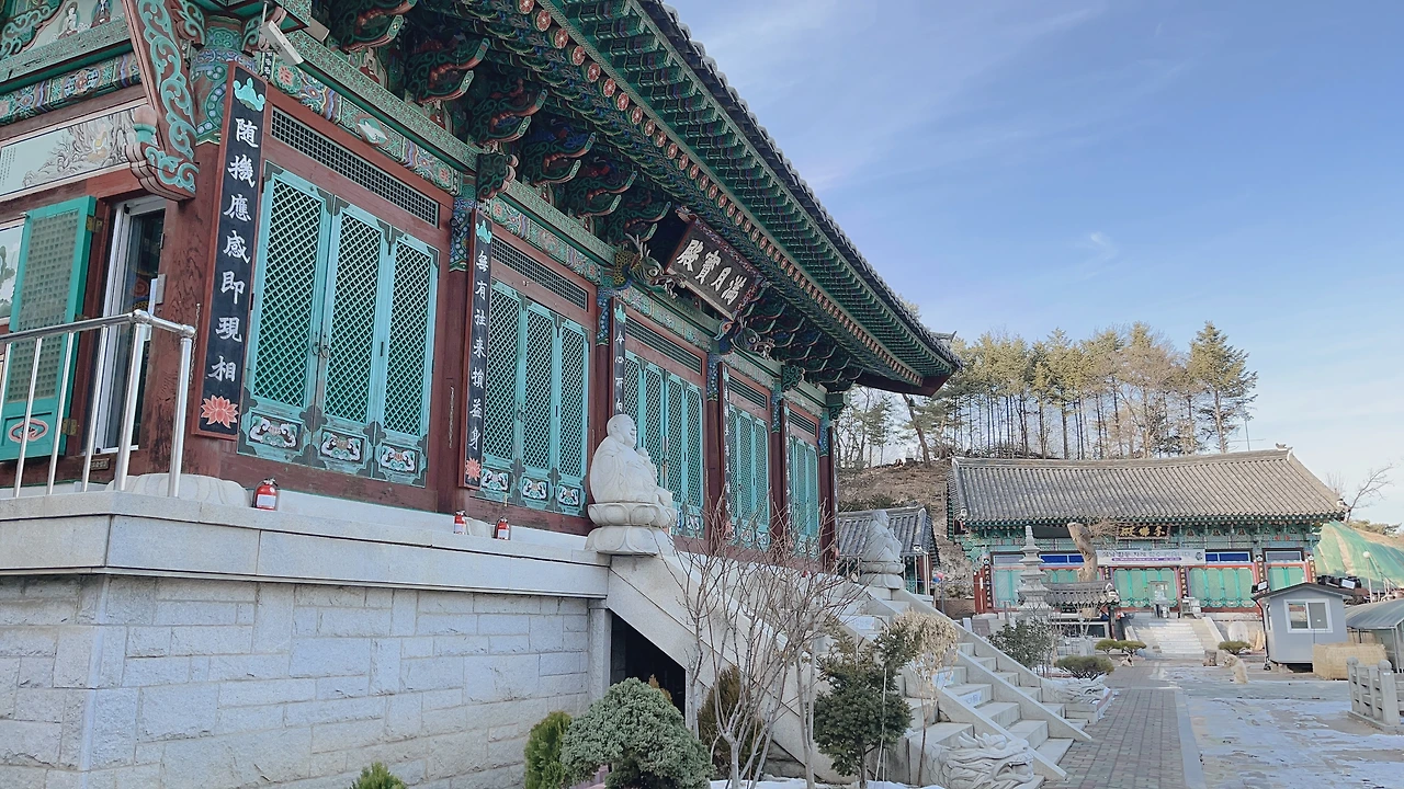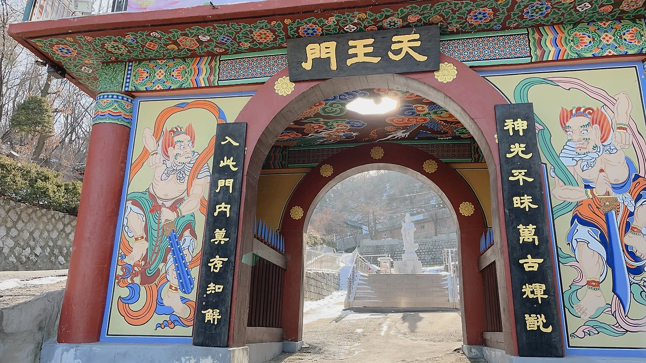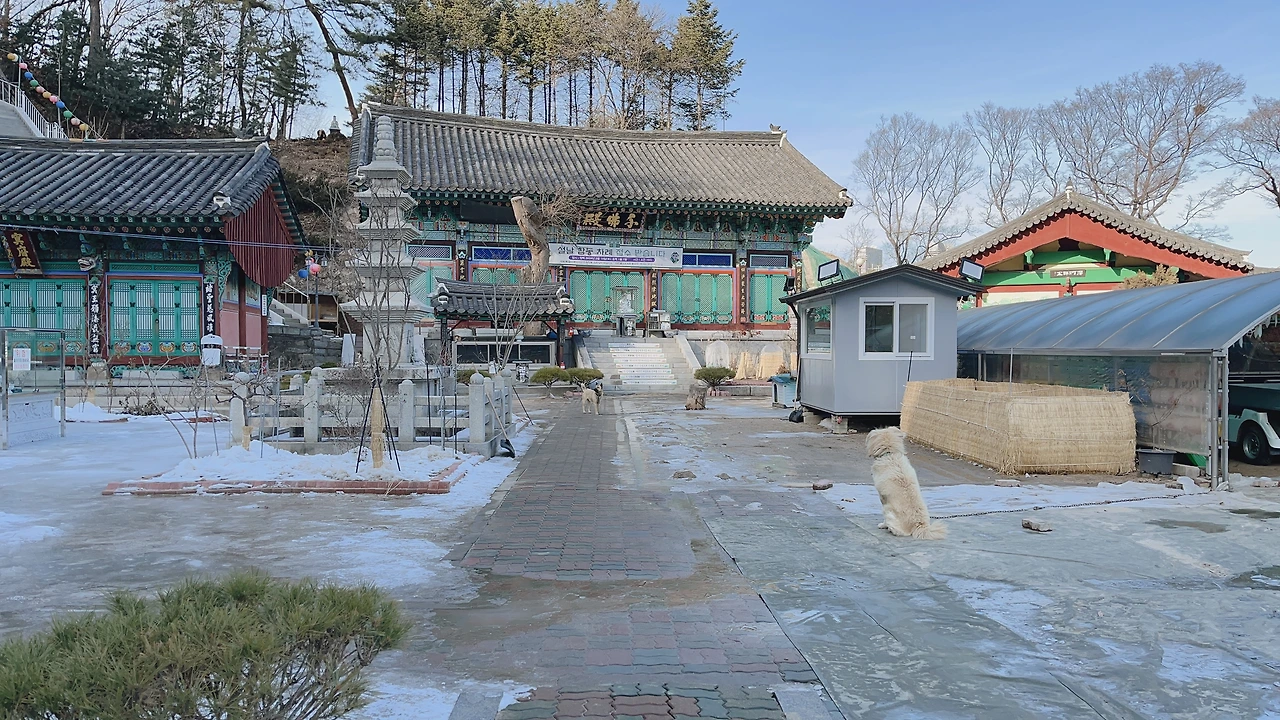 정류장 명에 맞게 바로 입구가 보였다. 불경소리가 들리길래 참 좋았는데 보니까 ASMR처럼 음악을 틀어놓은 거었다. 입구에 있는 일주문을 지나고 나서 나머지 건물은 길 하나 지나서 떨어져 있어서 언덕길을 올라갔다. 근데 막상 위쪽에는 문도 다 닫혀있고. 큰 개 세 마리가 마당에 묶여 있는데 나보고 막 짖어댄다.