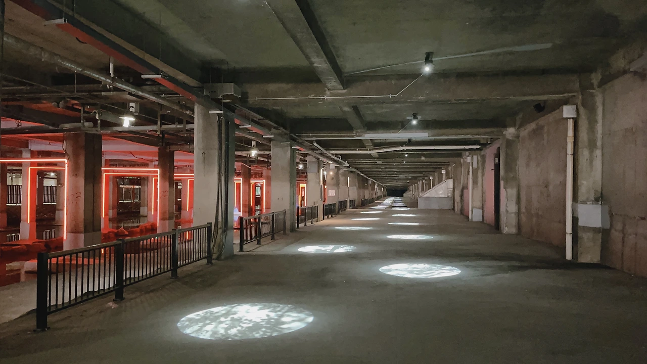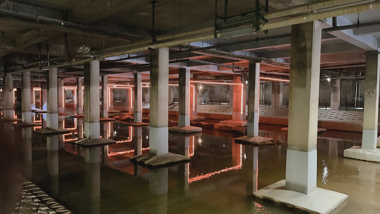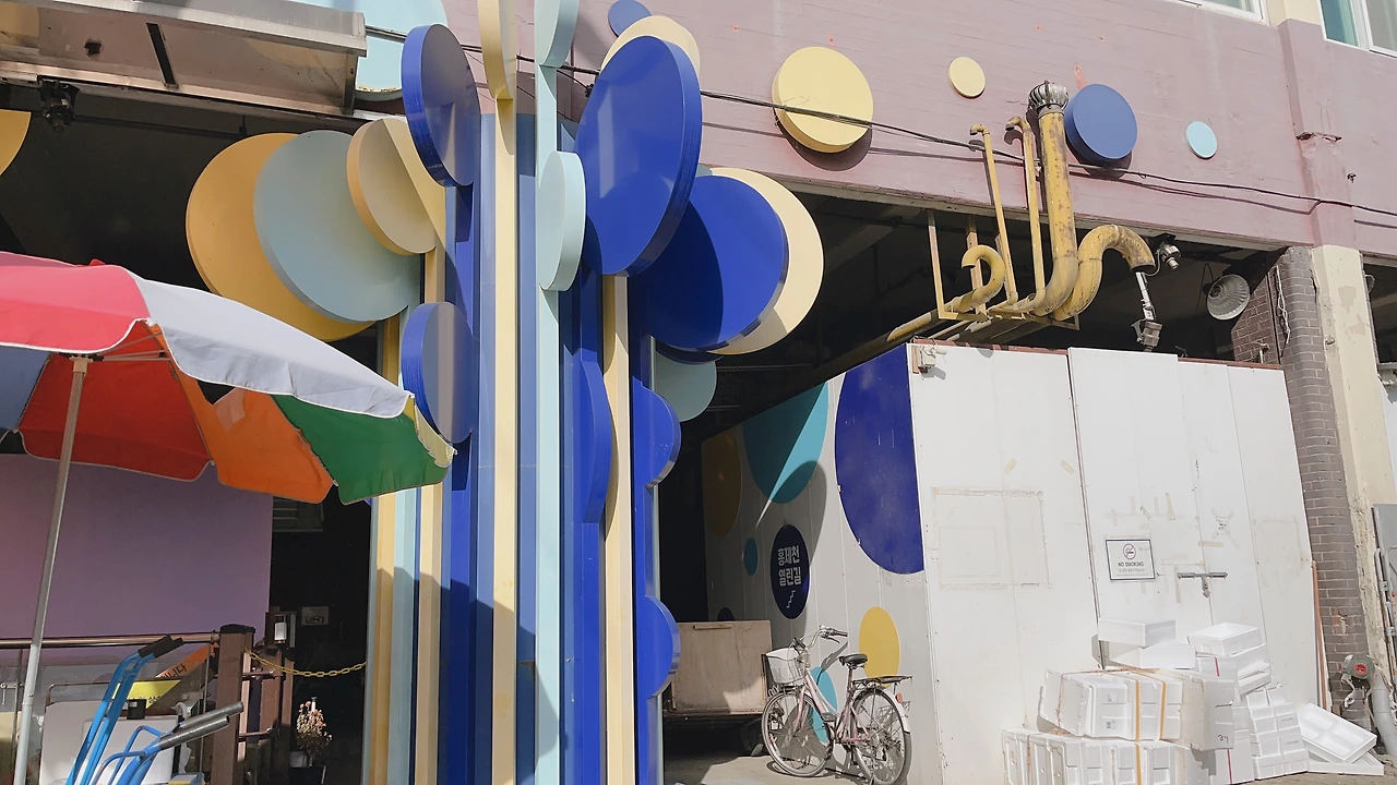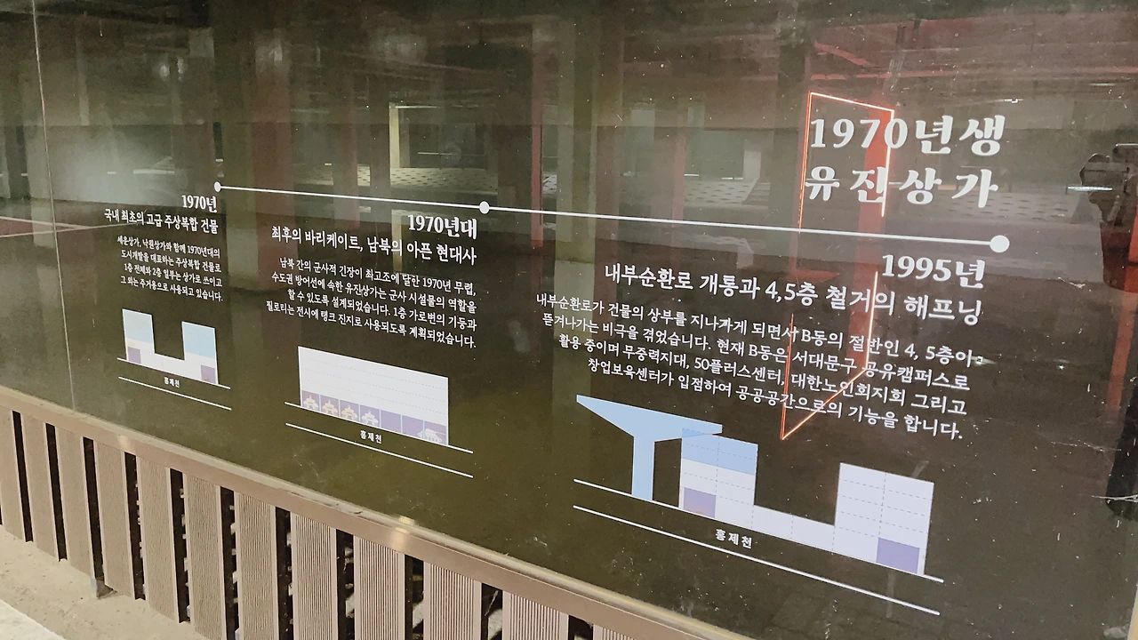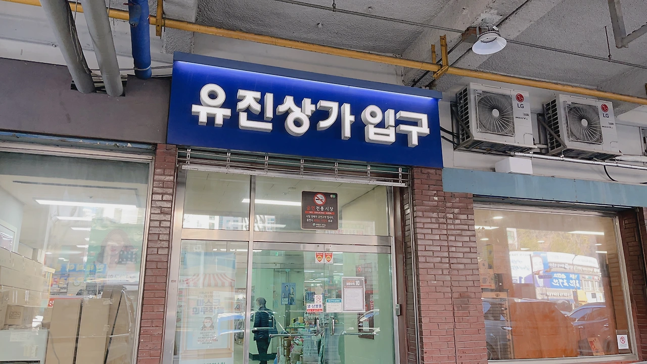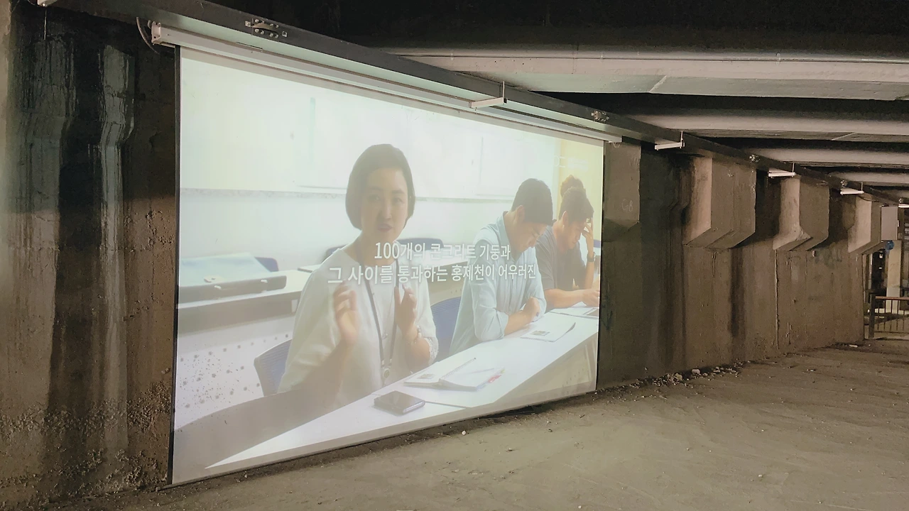 유진상가의 역사 소개하는 간략한 표지도 있고 중간에 돌 징검다리가 있어 건너가 보니 아까 나무판자 사이로 얼핏 얼핏 보이던 불빛 조형물이 제대로 보였다. 그리고 가는 길에 보니까 영상물도 있었는데 이 조형물을 만든 취지 이런 거 영상으로 나오더라. 여기서 장사하시는 분 인터뷰도 나오고.