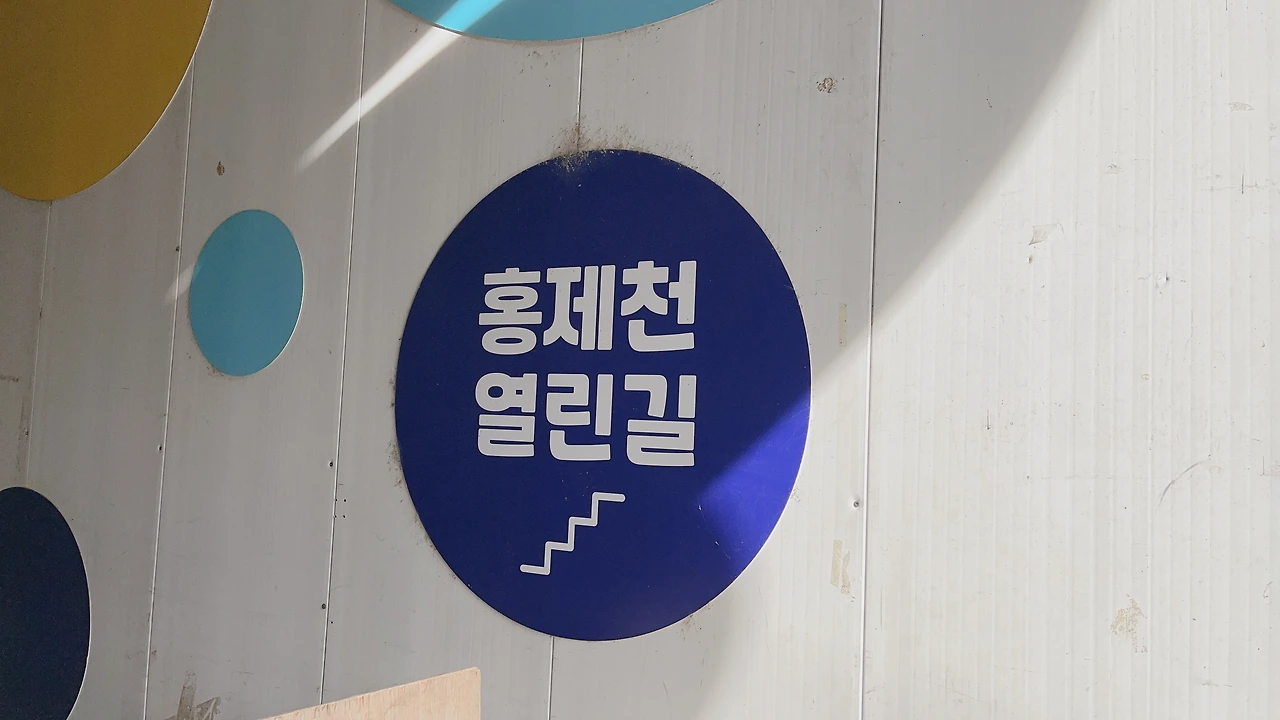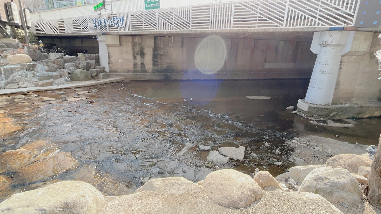 어느 친절한 블로거 안내에 따라 건물 중간쯤에 홍제천으로 내려가는 길이 있다고 해서 내려갔다. 다리 밑이라 어둑어둑하긴 했지만 약간의 조형물들도 있고 조깅하는 분들이 꽤 있었다. 자전거길도 있었다.