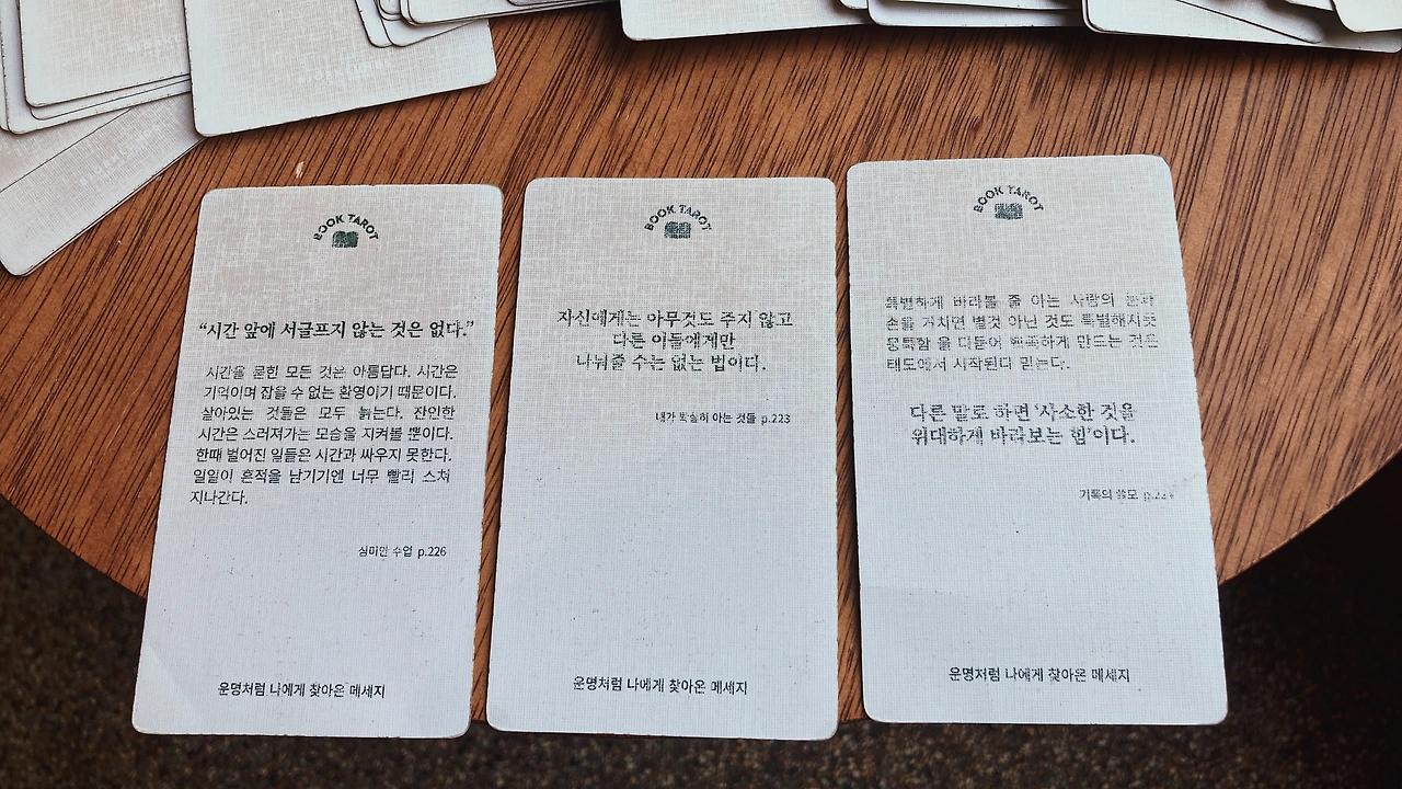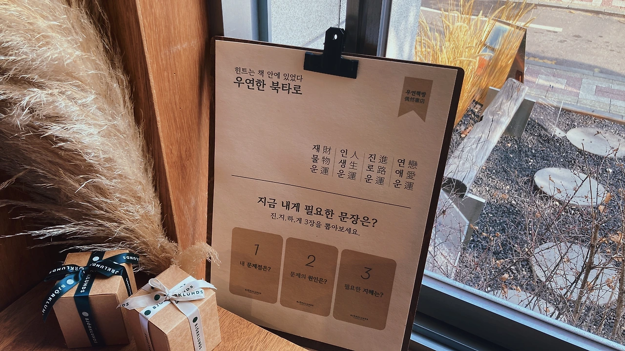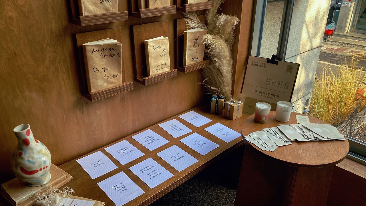 음악 소리는 좀 컸지만 전체적인 분위기가 우드톤이라 편안한 느낌이 들었다. 작게 책방 코너도 있고 책에서 뽑은 문장들로 만들어놓은 타로카드가 있었다. 질문을 보고 손가락 끝에 힘을 집중해서 손에 집히는 걸로 뽑았는데 해답이 될지 모르겠다.
