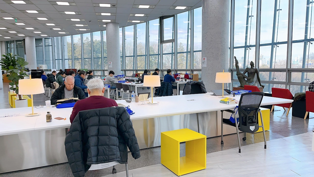 이게 전부인 줄 알고 이제 그만 가볼까? 해서 나왔는데 2층 로비 비슷한 공간에도 사람들이 앉아 있을 수 있도록 잘 되어 있다. 그리고 자세히 보니 옆건물로 건너가는 통로가 있네? 뭐지? 일단 이 열람실 출입증으로 갈 수 있는 데까진 가보자. 가다가 막혀 있으면 돌아오면 되고.