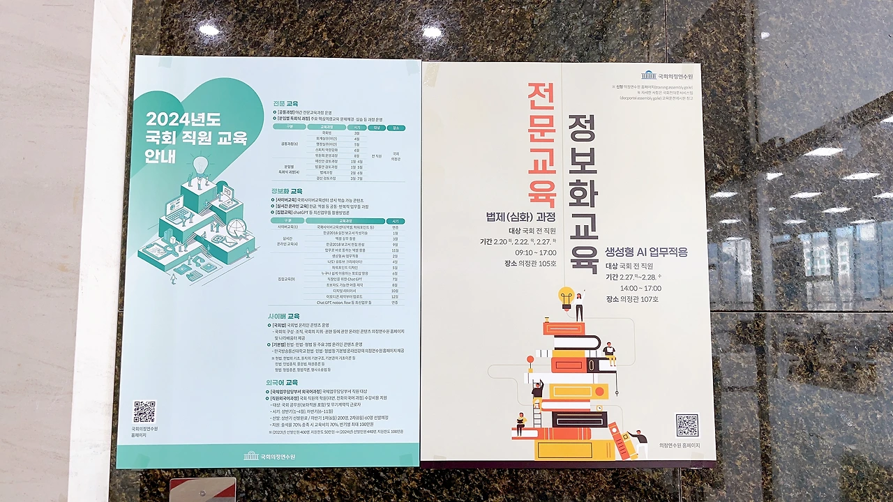 그리고 나오는데 나오는 길에 발견한 벽에 붙은 포스터! 국회 직원들을 위한 교육 어쩌고 저쩌고에다 챗GPT 교육도 있네. 웬만한 사기업 뺨치는데?! 심지어 공무원은 잘리지도 않잖아.