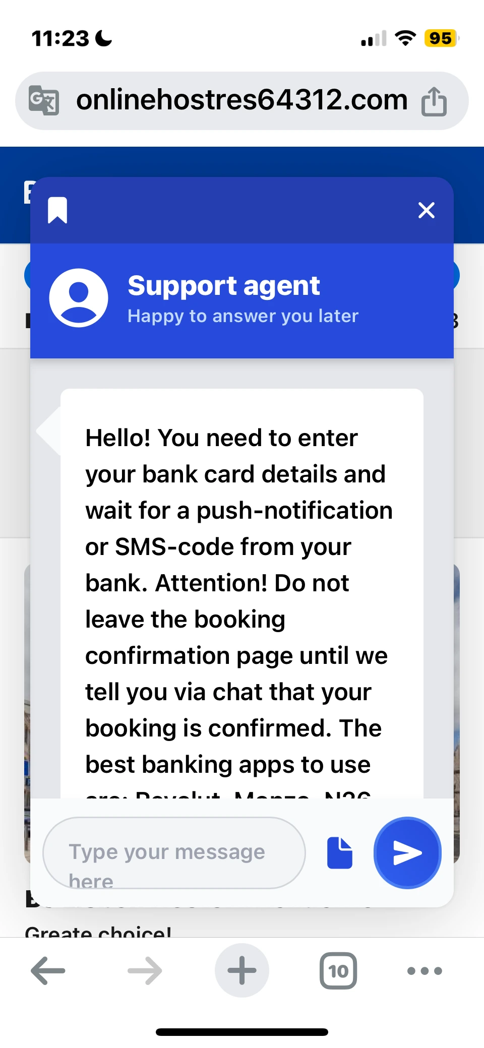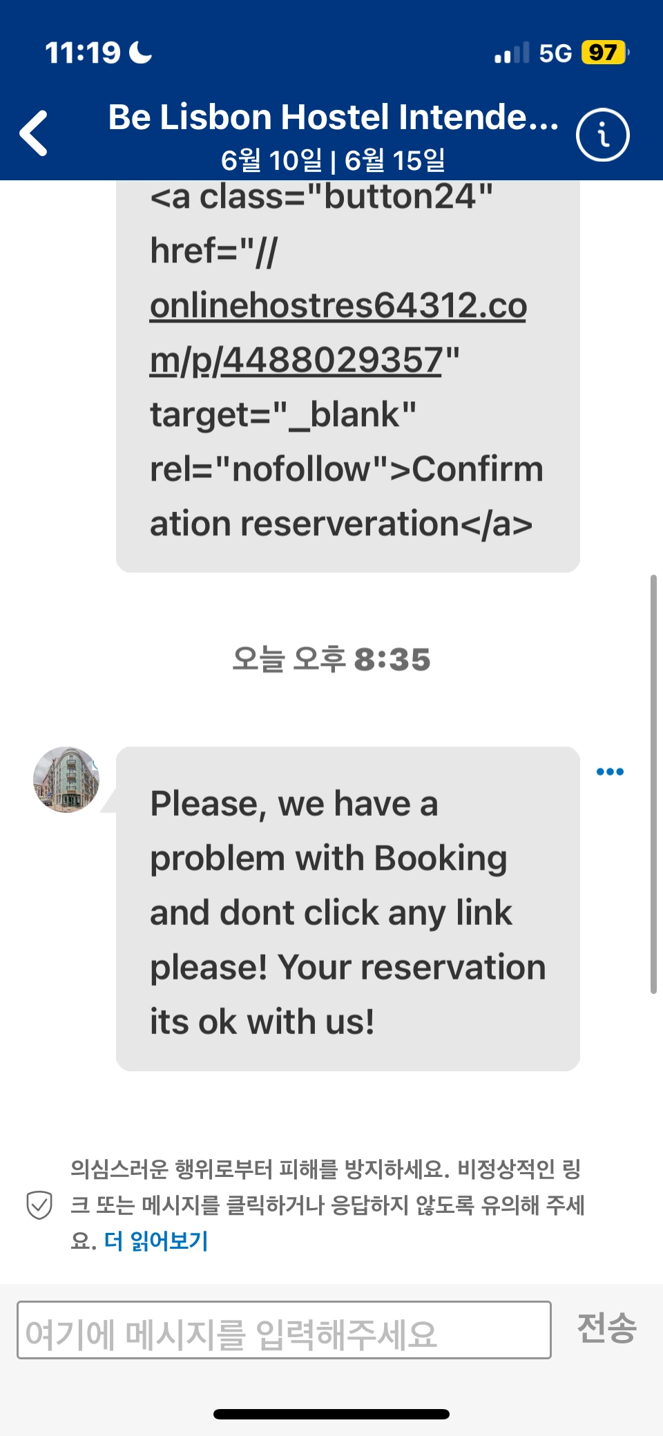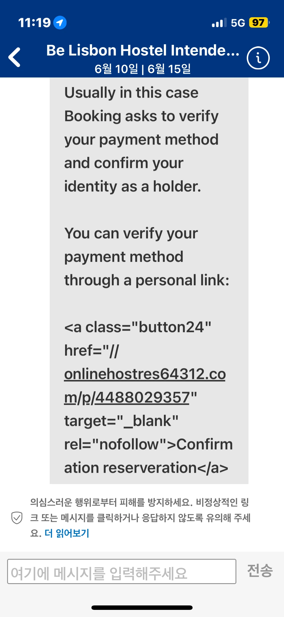 나는 부킹닷컴을 통해 포르투갈의 어느 숙소를 예약해뒀는데, 숙소에서 다이렉트 메시지로 내가 예약한 자리가 없어질지도 모른다며 선결제를 요구했다. 외부 메신저를 통해서 온 것도 아니고 약간 찜찜했지만 뭐에 홀린 듯 하나뿐인 신용카드 번호를 고스란히 입력하고 말았다.