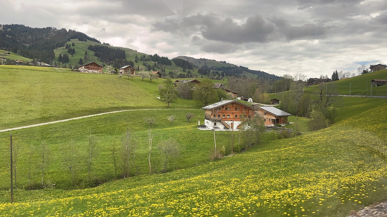 만년설이 있는 산이 있는 반면 기차가 지나는 아래쪽은 푸른 풀과 노란 민들레 같은 풀꽃이 가득하다. 중간중간 나무로 지어진 작은 집들이 있고 소들은 한가롭게 거닐며 풀을 뜯고 있다. 쟤네들은 스트레스 안 받을 거 같아 부럽다.