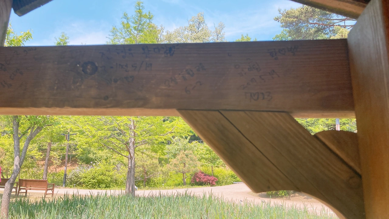이제 오두막 속 어둠에 눈이 익숙해지다 보니 낙서가 눈에 띈다. 최근 낙서도 있지만 2017년 낙서가 눈에 들어온다. 이때 초등학교 6학년이면 지금 몇 살이냐… 헉, 고3이다. 얘들아, 잘 지내니? 여기 낙서한 건 다 잊고 열공 중이겠구나. 힘내, 얘들아.
