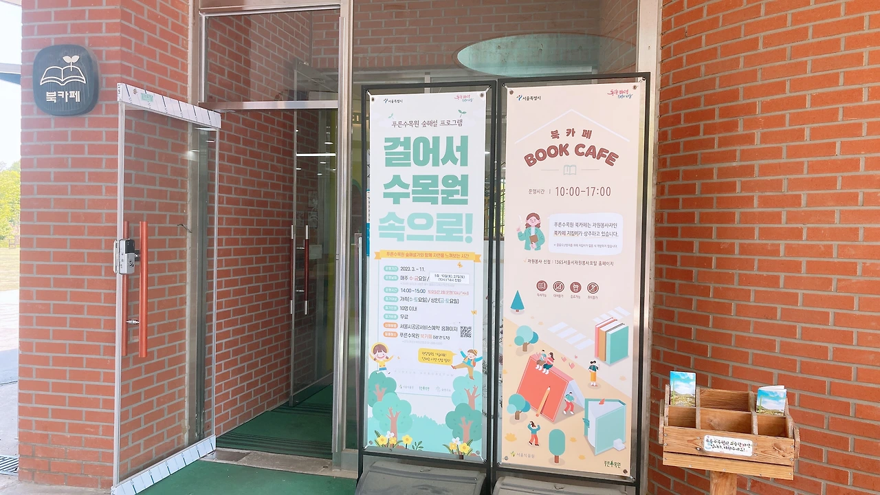 입장료는 무료지만 주차는 돈을 약간 내야 한다. 그래도 주차할 곳이 있으니 다행이다. 평일이라 자리가 많이 남아 있었다. 수목원으로 들어가는 입구 왼쪽에는 카페가 있고 오른쪽에는 북카페가 있다. 이런 장소에 북카페가 있다는 게 신기해서 들어가 본다.