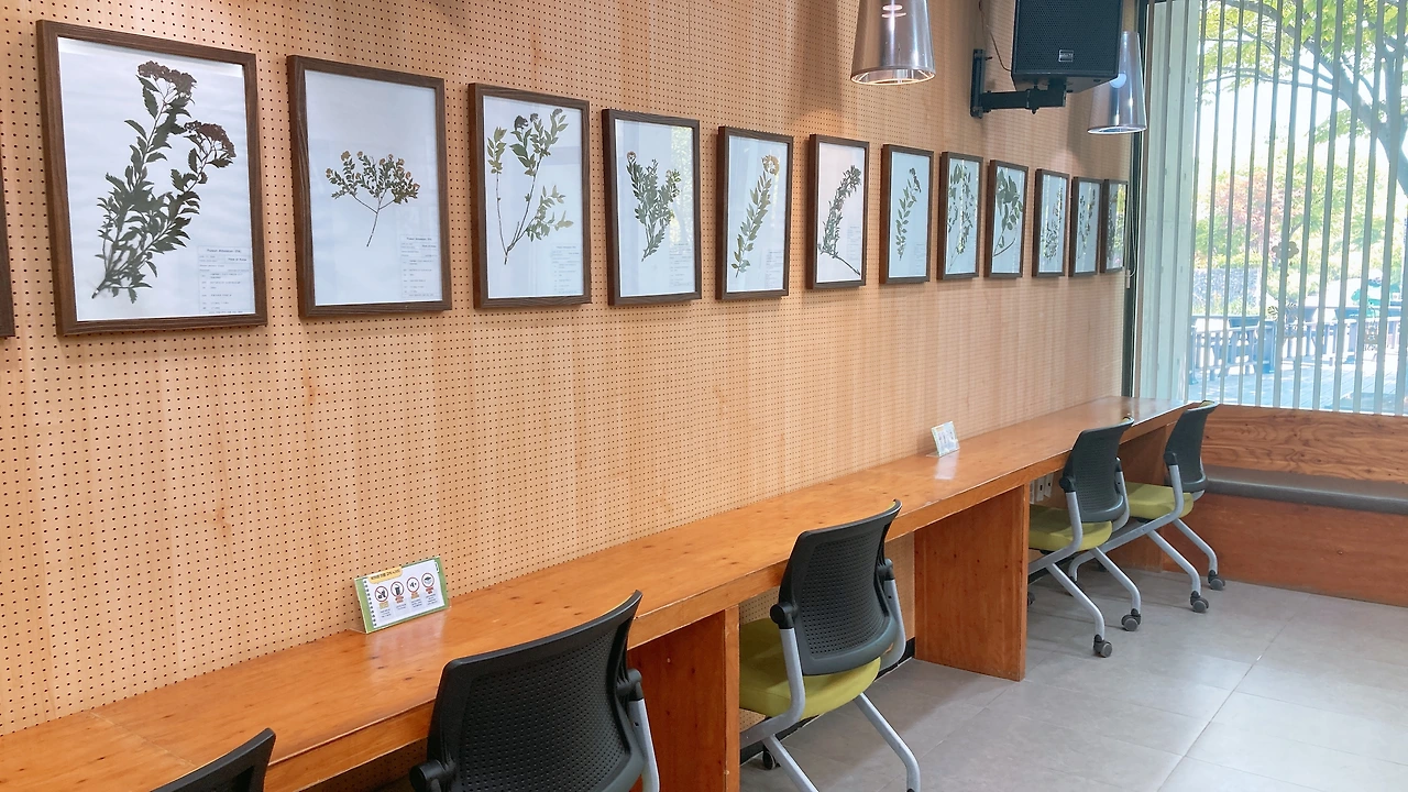 작지만 깔끔했다. 벽면엔 액자처럼 식물 표본이 걸려 있었고 이름이 북카페인만큼 반대쪽에는 책도 있었다. 아이들을 위한 동화책이나 그림책도 있었고 어른들을 위한 '삶은 무엇인가'와 같은 철학서도 있었다. 북카페가 있는 곳이 수목원이니만큼 주제에 맞게 정원 가꾸기나 야생화 도감 같은 책들도 눈에 띄었다. 차분히 앉아서 책을 읽고 싶지만 오늘은 일정이 있어 서둘러야 했기에 쓱 둘러보기만 하고 나왔다.