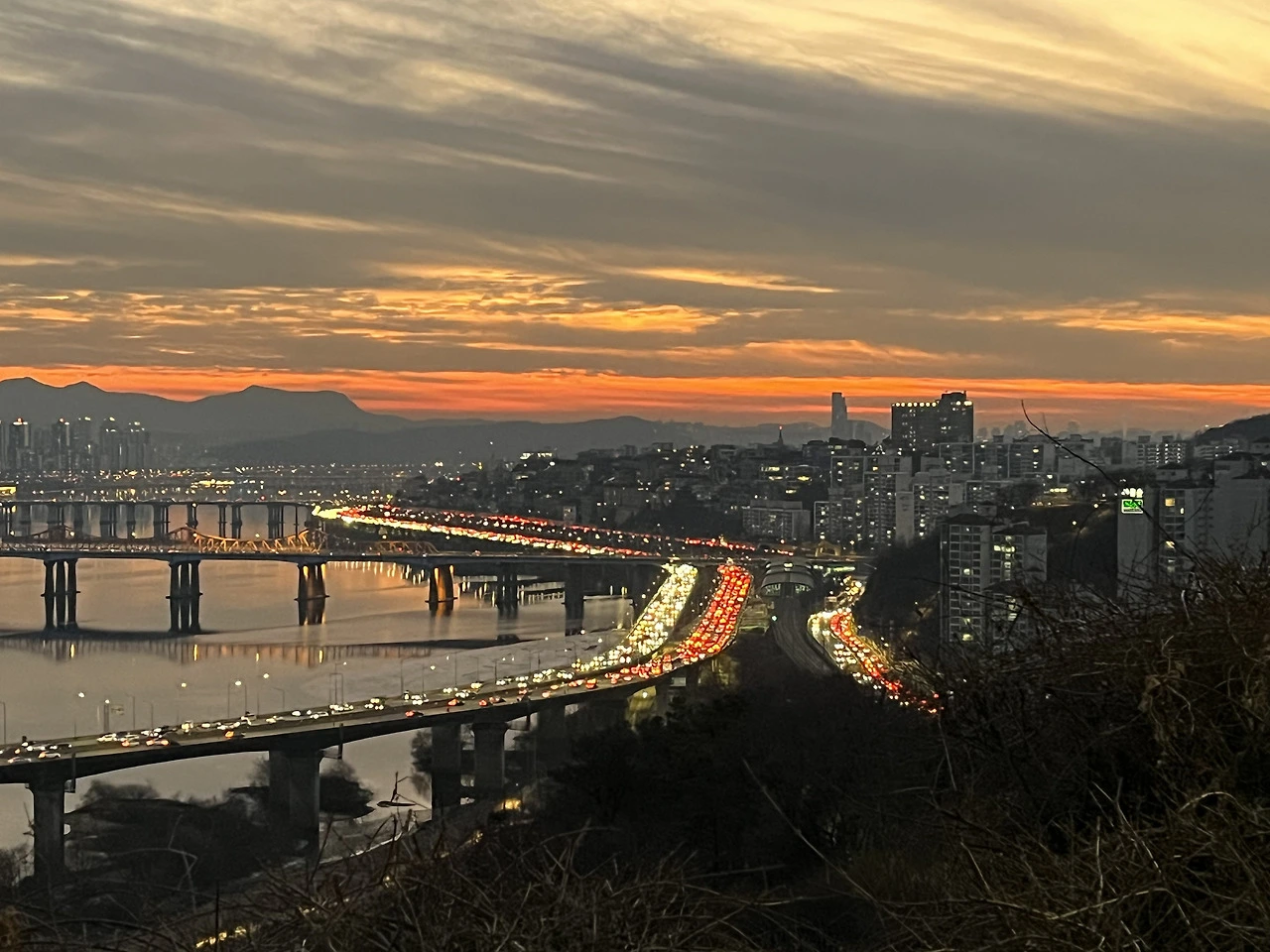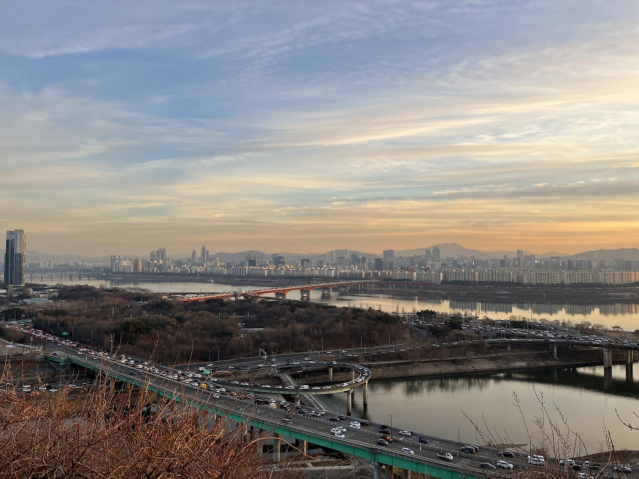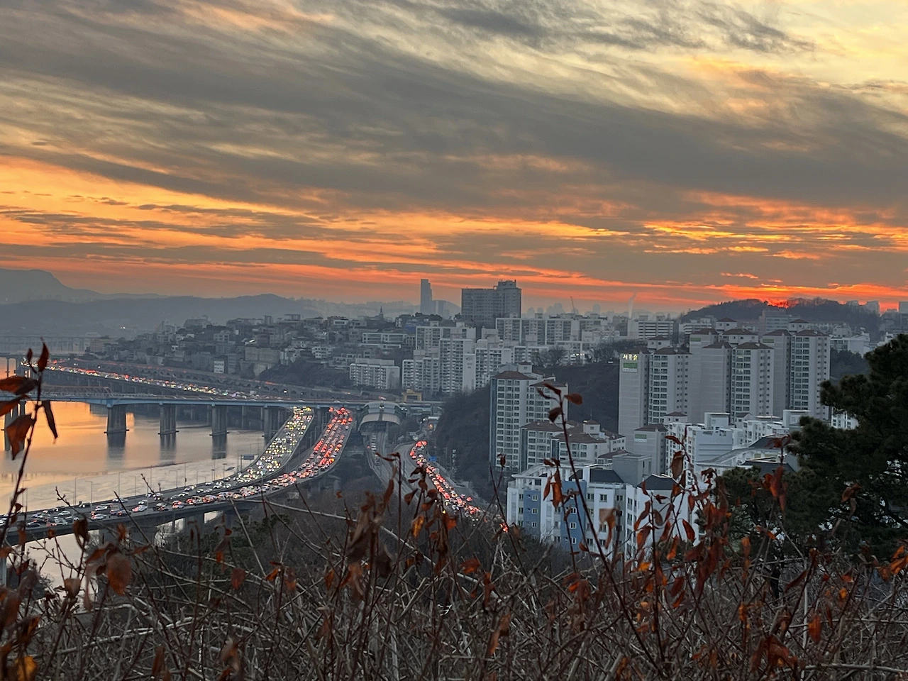 하늘엔 붉은 노을이 지상엔 붉은 차량 후미등이 서로 약속이나 한 듯이 서로의 시간을 교체하자는 표시를 보내는 것처럼. 신기했다. 여기 올라와야만 보이는 볼 수 있는 것들이다.