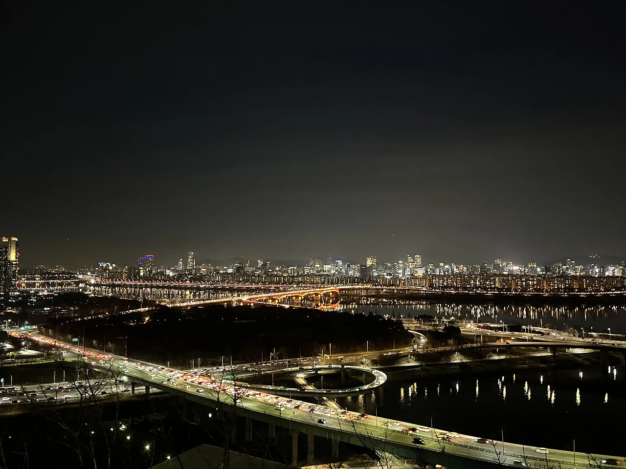 그런데 그것과 대조되어서 보였던 게 바로 아래에 있는 강변북로에 늘어서있는 차들의 조명이 용산구 쪽으로 향하는 즉 나한테 뒤꽁무니를 보이는 차들은 전부 빨간빛을 반대로 내 쪽으로 오는 차들은, 성동구 쪽으로 오는 차들은 전부 하얀빛 아님 약간 노란빛을 띠며 차들이 움직이고 있었다.