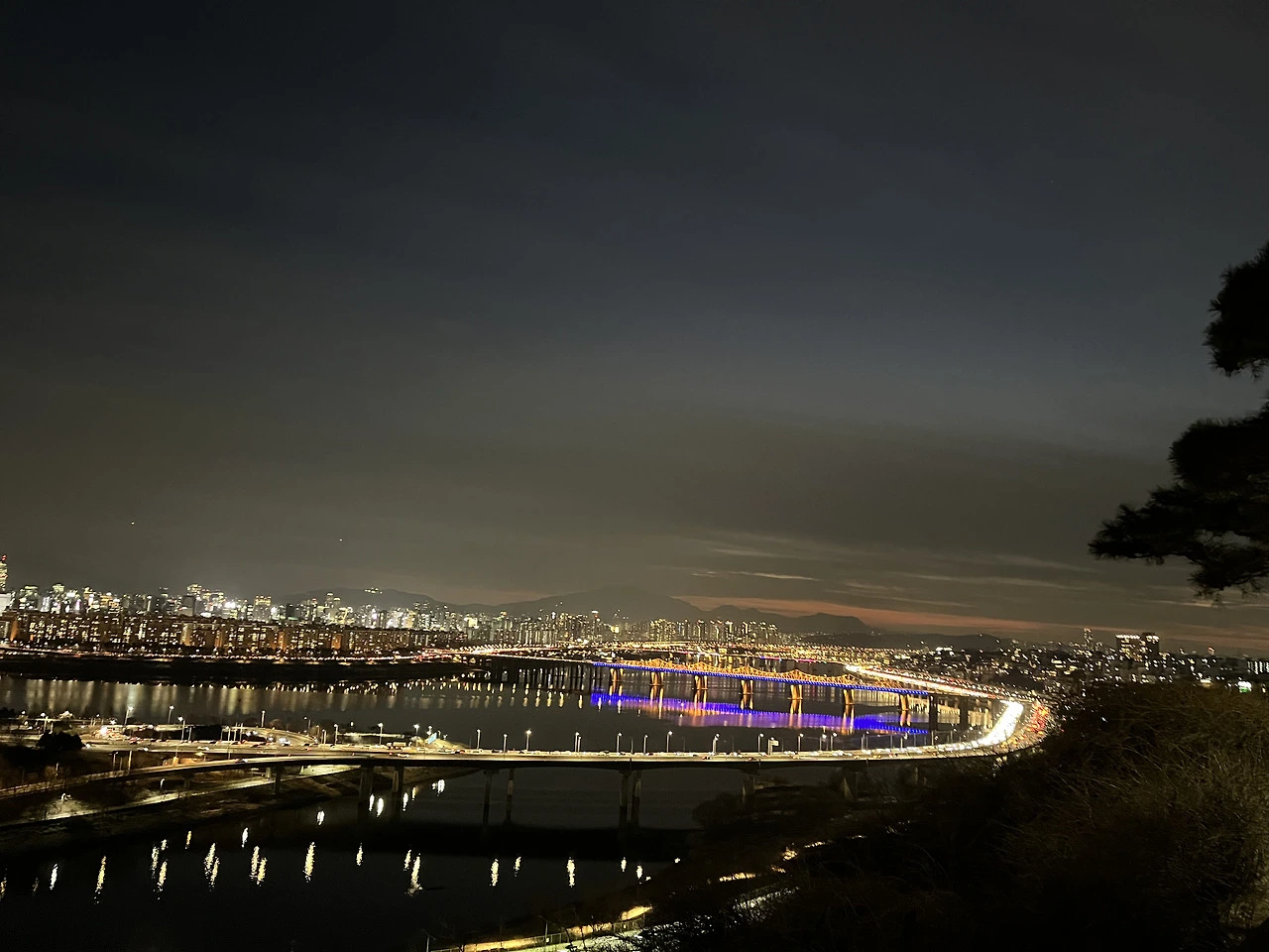 점점 어두워진다. 해는 시야에서는 사라졌어도 여전히 빛을 보여주고 있다. 3호선 철길이 함께 지나가는 동호대교엔 파란불이 들어와 있어서 눈에 띈다.