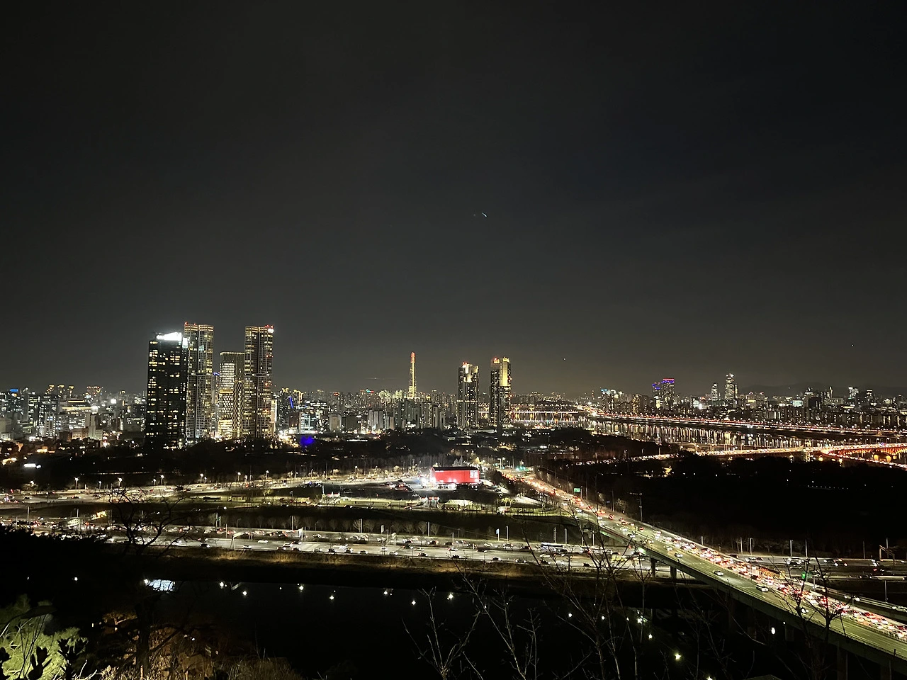 오늘 아침에 꾼 산 불나는 꿈은 오늘 이런 야경을 보게 되리라는 암시였을까 하는 엉뚱한 상상을 해본다. 불나는 꿈은 대체로 길몽이라는데 현금을 안 챙겨 나와서 복권을 사지 못했다.