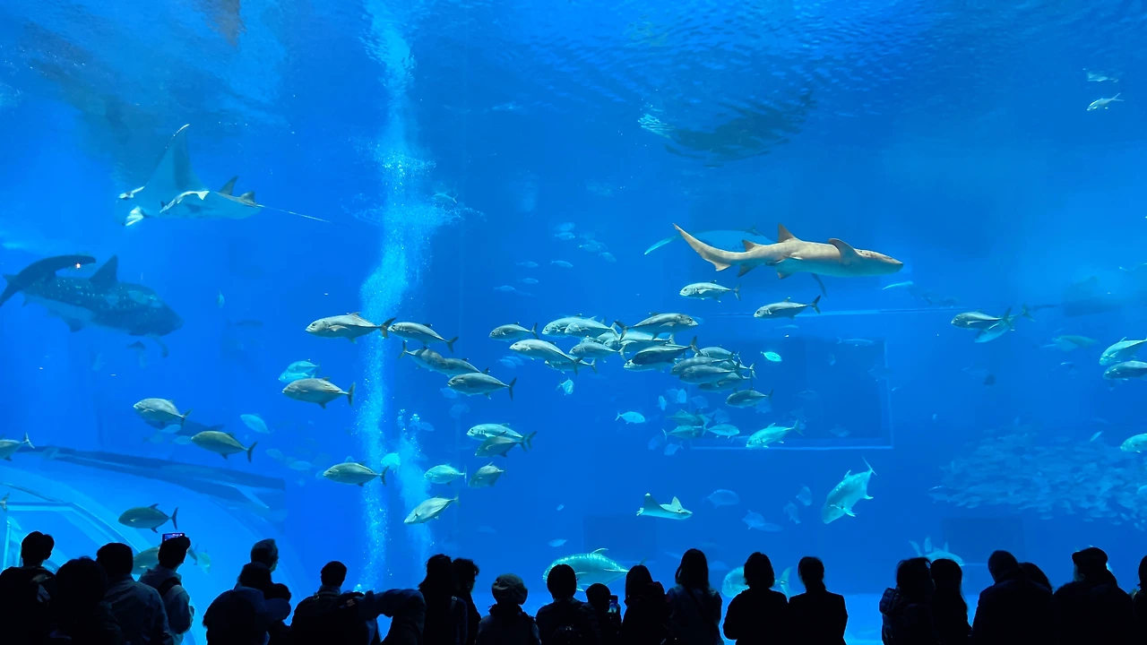 추라우미 수족관의 메인 수조 앞에서 혼자 시간 보내기
