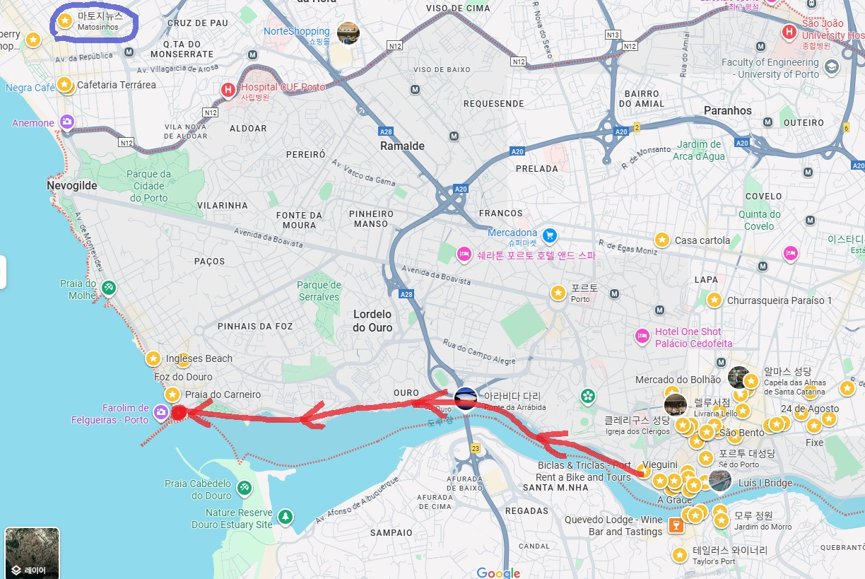 그래도 이왕 여기까지 왔으니 대서양 앞마당까지는 가자. 바로 강과 대서양이 만나는 지점. 그 지점은 앞으로 약 5km를 가야 했다. 지도 상은 20분 거리였는데 나는 그 두 배인 40분이 걸려 도착했다. 그래, 바다 봤으면 됐지 뭐. 마토지뉴스 해변은 내일 편하게 버스 타고 갔다 오자.
