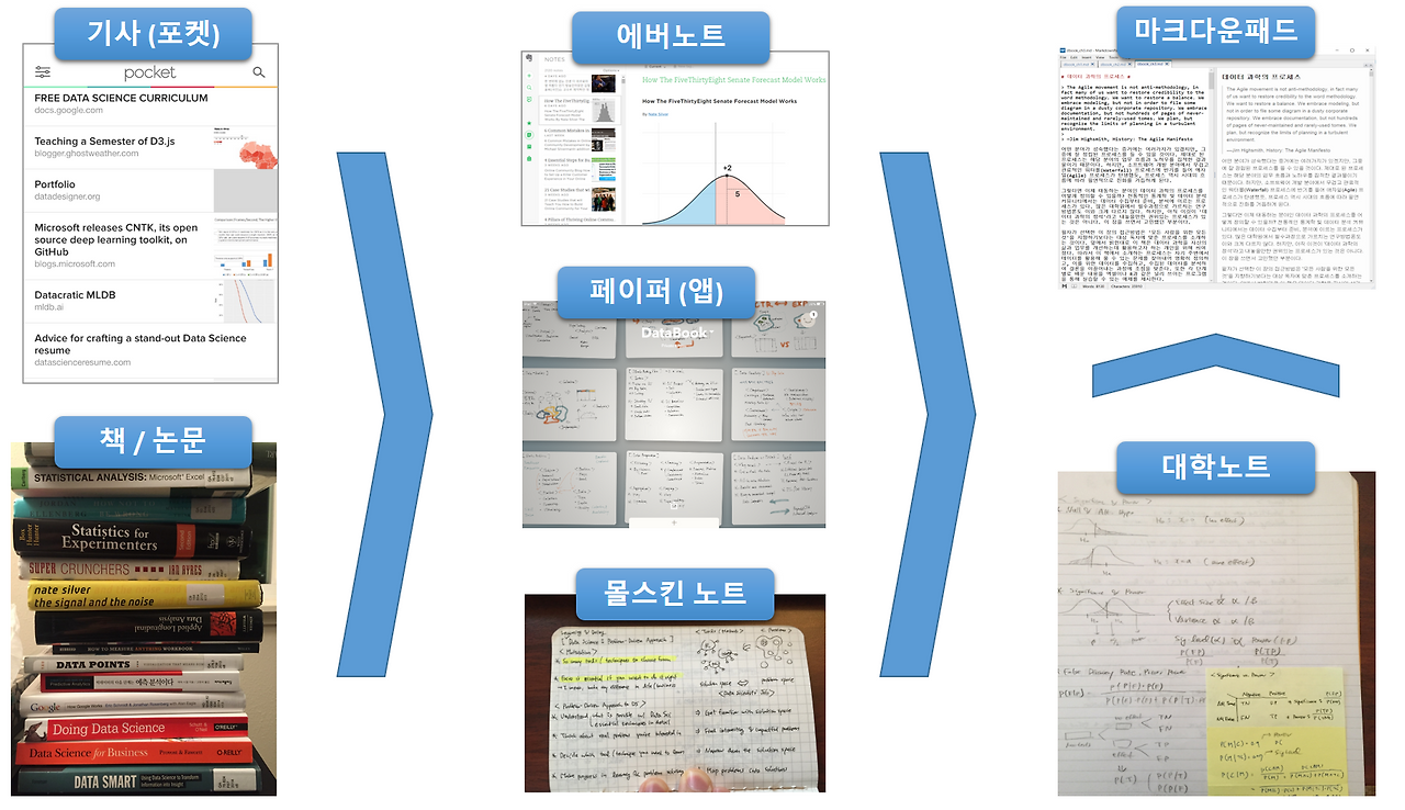이 과정을 차근차근 살펴보자. 우선 왼쪽의 지식 습득 부분에서는 온라인 아티클과 논문, 그리고 책의 형태로 집필할 내용에 대한 다양한 자료를 섭렵하였다. 끊임없이 진화하는 데이터 과학이라는 분야의 특성상 집필 작업을 하는 중간중간에도 계속 새로운 자료가 쏟아졌는데, 집필 일정이 늦어지더라도 이를 최대한 습득하려고 애썼다. 온라인 아티클의 경우 우선 포켓에 저장하고, 주의 깊게 읽을 자료는 에버노트에서 읽으면서 주석을 달았다. 종이책의 경우 읽은 후 최대한 빨리 주요 부분을 에버노트 등에 옮겨 적었다.