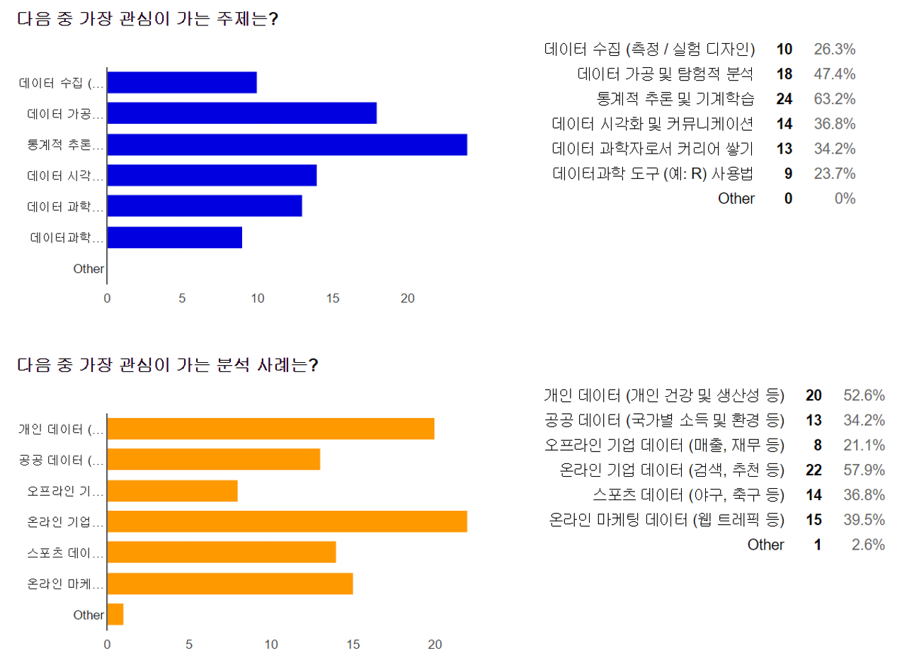 독자 그룹의 분들께는 새 글도 먼저 보내드리고, 데이터 과학 관련 자료를 공유하기도 했다. 메일링 리스트 관리를 위해서 사용한 MailChimp는 이런 메일 기반의 소통을 위해 굉장히 효과적인 도구였다. 내가 보낸 메일에 대한 독자들의 응답률 등을 실시간으로 알 수 있었기 때문이다. 주기적으로 독자 분들의 관심사 및 주로 사용하는 도구를 파악하기 위한 서베이도 진행했다. 아래 서베이 결과 중 일부를 소개한다.