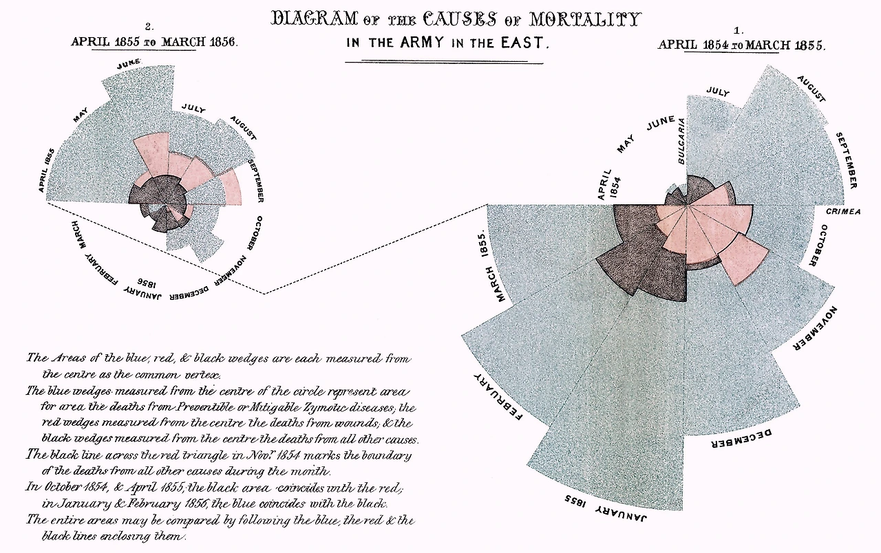 현대적인 컴퓨터와 통계 이론이 등장하기 훨씬 전부터 데이터를 통해 다양한 문제를 해결했던 역사속 위인들의 이야기를 통해 데이터가 기술이 아니라 마인드라는 명제의 의미를 구체적으로 알아보자. 많은 사람들이 간호사로 알고 있는 플로렌스 나이팅게일은 19세기 말 크림전쟁 당시 전선에서와 후방의 병원에서 훨씬 많은 환자들이 죽어간다는 사실을 발견했다. 그녀는 자신의 발견을 다른 사람에게 알리기 위해 오늘날의 파이 차트와 유사한 당시에는 새로운 데이터 시각화 기법 등을 고안했고, 이런 그녀의 노력으로 후방 의료시설의 위생 상태가 개선되면서 후방에서의 사망률을 1/10로 낮출 수 있었다.
