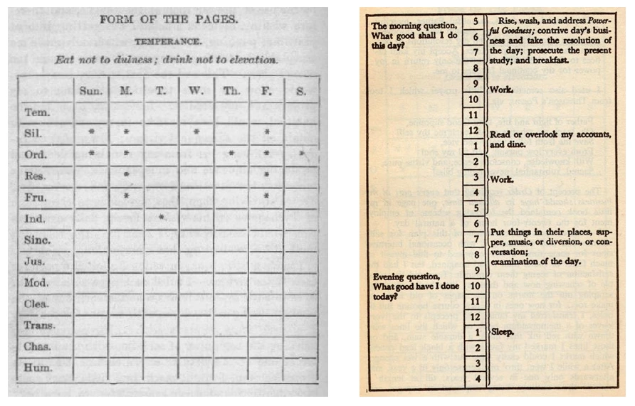 사회 문제가 아닌 개인의 수양을 위해 데이터를 사용한 사례도 있다. 피뢰침 등 수많은 발명품과 함께 미국의 국부로 추앙받는 벤자민 프랭클린은 20대에 자신이 매일 지키고자 하는 13가지 덕목을 정하고 이를 지켰는지를 아래 왼쪽과 같은 표에 매일 기록하며 자신의 인격을 완성시키려 평생 애썼다. 또한 이 과정에서 자신을 다잡기 위해 아래 오른쪽과 같은 일상의 기록을 남겼다. 시스템 다이어리의 대명사가 된 프랭클린 다이어리는 여기서 기원하는 이름이다.