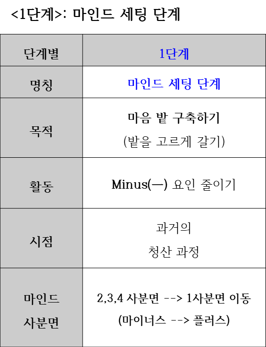 이 과정을 사분면 그림으로도 나타낼 수 있다. 전체 4개의 사분면 중에서, 마이너스 요인이 하나라도 있는 2 사분면, 3 사분면, 4 사분면의 위치로 이탈한 상태의 마인드를, 원래의 상태였던 ‘원점(0,0)이나 1 사분면’으로 복귀시키는 단계가 바로 ‘마인드 세팅’인 것이다. 최소한 ‘마이너스(-)’ 요소들은 존재하지 않았던 ‘나의 초기 마인드 상태’로 환경 세팅을 하는 단계이다. 즉, 과거의 어느 시점부터 계속 쌓여온 부정적인 ‘마이너스 요인’들부터 줄여서 없애버리는 ‘과거의 청산 과정’에 해당된다. 마음속의 찌꺼기부터 청소하는 과정이라고 할 수 있겠다.