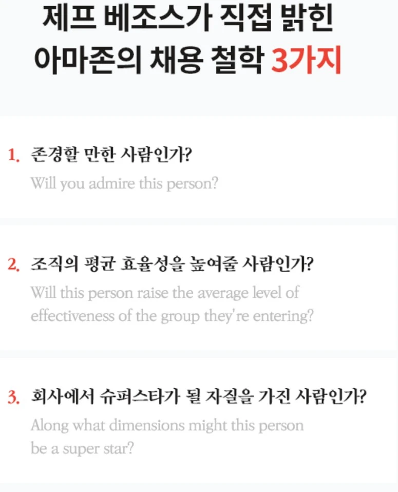 1번의 ‘존경할 만한 사람인가?’는 그저 좋은 가치라고 여기면서 단순히 쓱 지나치기 전에, 베조스가 CEO였다는 입장을 생각해 보면 절대 가볍게 볼만한 추상적인 철학이 아니다. 리더가 훌륭한 신입 직원을 속으로 몰래 괜찮게 생각하는 것으로만 그치는 것이 아니라 대놓고 ‘존경하고 싶어 하는’ 그런 마음가짐의 그릇을 가진 사람이라면, 미래에도 조직을 성장시킬 수밖에 없는 성향을 가지고 있는 것과 다름없는 것일 거다. 직원의 직급이나 조건, 연령에 상관없이 개개인 스스로의 가치를 있는 그대로 인정하고, 그런 점들을 추구하면서 배우고자 하는 열린 마음까지 내재되어 있는 것이 물씬 느껴지기 때문이다.