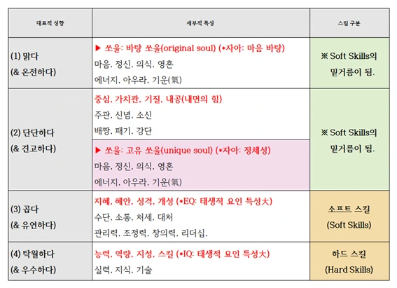 특히 ‘곱다’의 성향은 ‘유연하다’는 뜻을 내포하는 특성들인 만큼, 이런 ‘소프트 스킬’에 가장 가까운 역량에 해당된다. 물론 ‘맑음’과 ‘단단함’ 또한 수량적인 특성이 아닌 질적인 성향이라서 기본적으로 소프트 스킬과 관련이 있지만, 이와 동시에 소프트 스킬의 대표적인 성향인 ‘곱다’의 특성들에 꽤나 도움이 되어주는 밑거름의 역할도 크다고 할 수 있다.