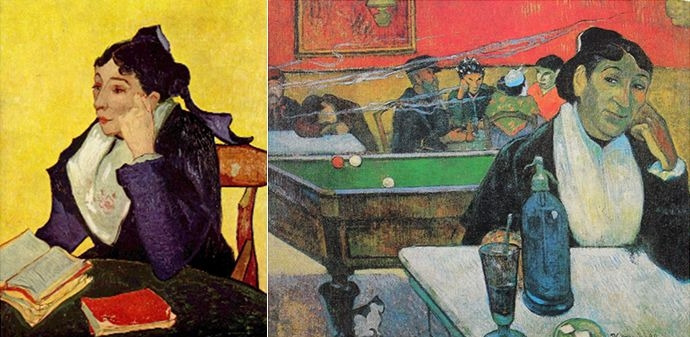 위의 그림 두 개는 모두 ‘지누 부인’이 등장하지만, 같은 사람이라고 하기에는 사뭇 다른 분위기가 느껴진다는 것을 한눈에 봐도 알 수 있을 것이다. 우측의 고갱 그림에서는 카페 주인답게 마음이 넓어 보이는 단골집 아줌마 같은 푸근한 분위기라면, 좌측의 고흐 그림에서는 그런 카페 주인의 모습은 거의 알아채기도 힘들 만큼 무언가 사색에 빠져있는 분위기가 우러나오는 여인 한 명 그 자체의 모습에 가깝다. 같은 여인일지라도 어떤 부분에 더 초점을 두느냐에 따라서 그림의 분위기나 시선은 얼마든지 달라질 수 있는 것이므로, 두 화가 모두 각자의 관점에서는 나름의 인간적인 모습을 담은 그림들이라고 할 수도 있겠다. 고갱은 카페 주인으로서의 인간적인 모습을 담은 것일 테고, 고흐는 진짜 한 여인으로서의 인간적인 모습을 담은 것일 테니깐 말이다.