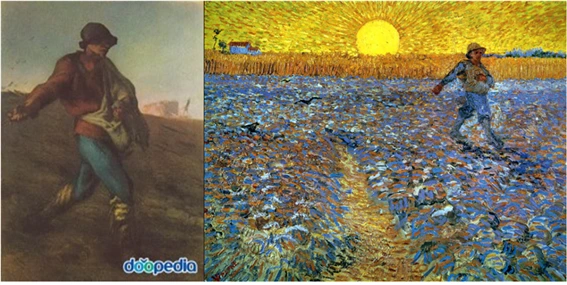 위의 두 개 그림은 모두 <씨 뿌리는 사람>이지만, 왼쪽은 장프랑수아 밀레의 작품이고 오른쪽이 반 고흐의 작품이다. 밀레는 평소에 고흐가 존경하는 화가 중 하나였으므로, 밀레의 모작도 많이 그린 편이다. 그래서 두 개의 그림을 얼핏 보면 비슷한 느낌이 많이 나는 것 같지만, 그림 속의 주인공인 ‘씨 뿌리는 사람’을 번갈아 가면서 동시에 감상해 보면 뭔가 미세한 느낌적인 차이가 있다는 걸 감지할 수가 있다.
